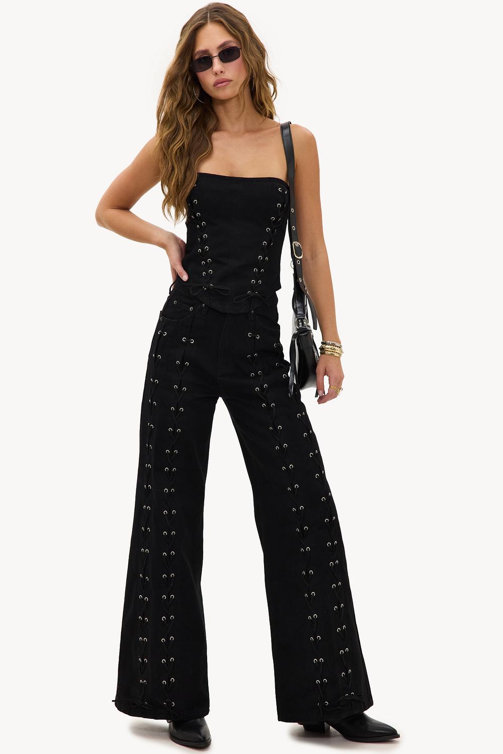Este corsé de mezclilla negra presenta detalles llamativos de cordones por todas partes para un look atrevido y llamativo. El ajuste sin tirantes con cinturón acentúa la forma de manera moderna. La mezcla de algodón asegura comodidad mientras que el estilo corsé crea una apariencia rock-chic. Combina este corsé con los pantalones de pierna ancha a juego para un look coordinado completo.
