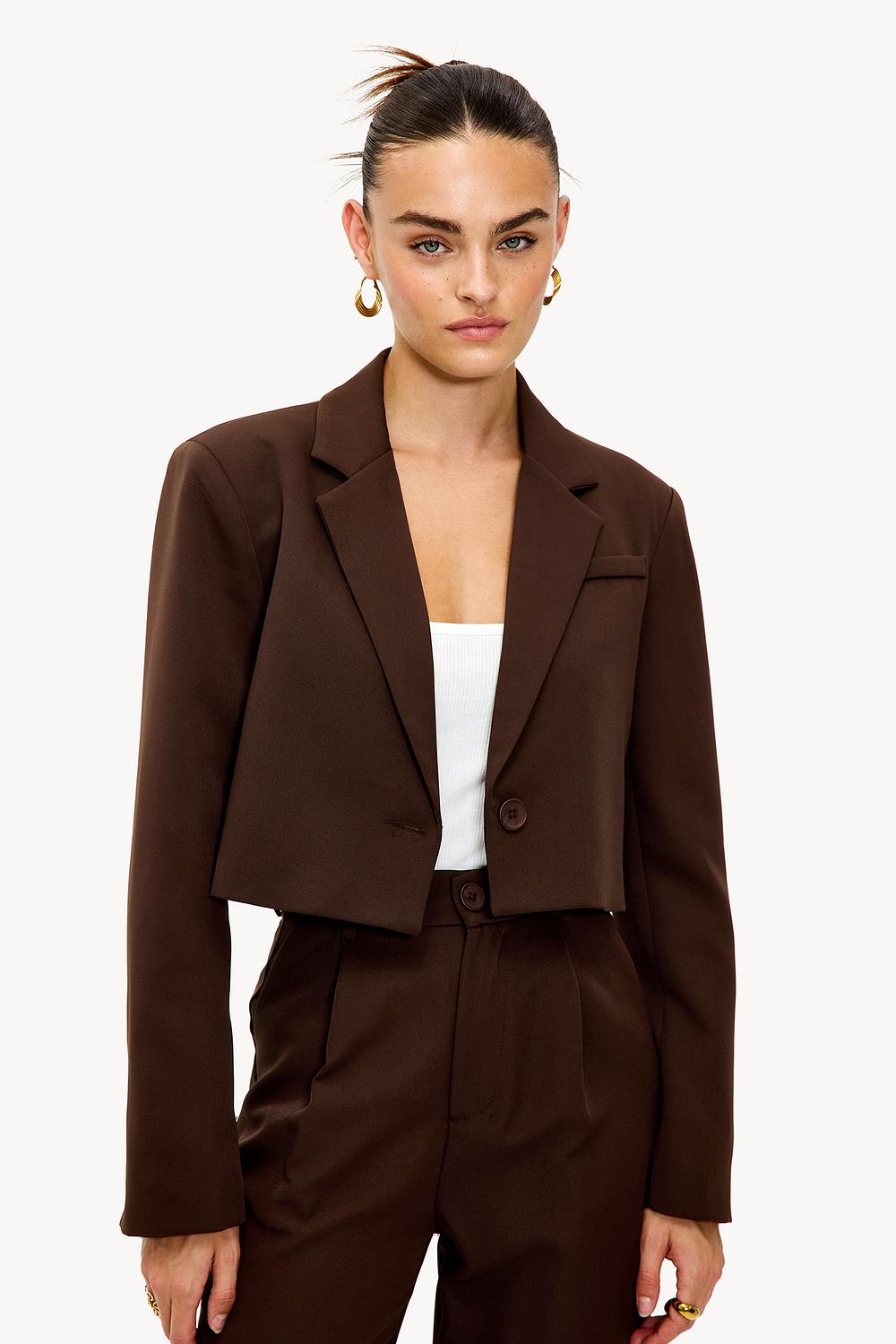 Esta blazer corta de color marrón oscuro tiene un ajuste entallado con cierre de botón. El ajuste corto crea un giro moderno en el diseño atemporal del blazer. La mezcla de poliéster asegura comodidad y una apariencia lujosa. Combina este blazer con jeans de pierna ancha y un collar llamativo para un look casual y elegante.