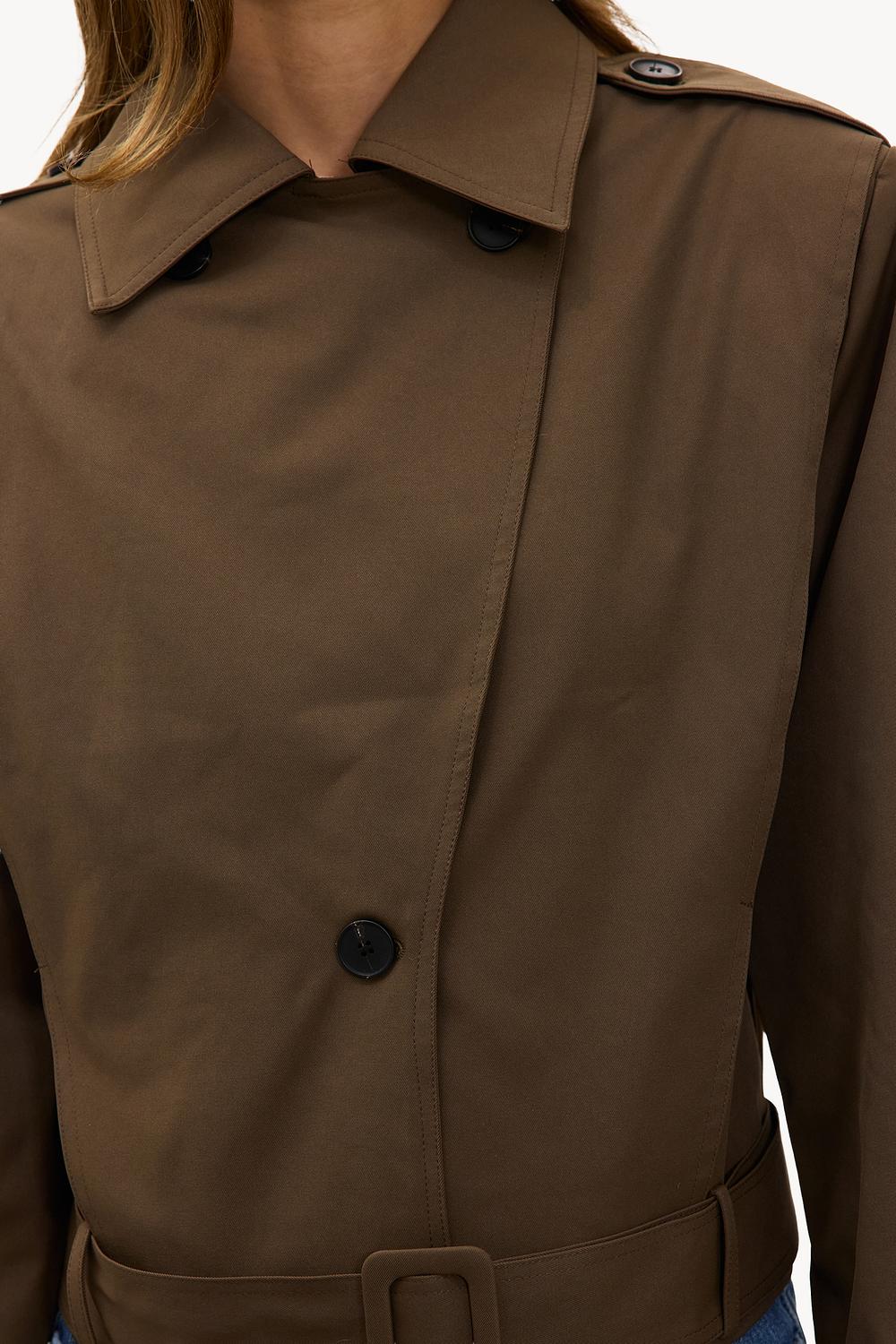 Esta gabardina marrón tiene un ajuste corto y recortado con detalles plisados llamativos en la parte inferior. El cierre clásico de doble botonadura con cinturón crea una forma entallada. Las solapas sobredimensionadas y las proporciones modernas le dan a este abrigo un giro actualizado al diseño atemporal de la gabardina. Combina este abrigo con botas altas para un look urbano chic.