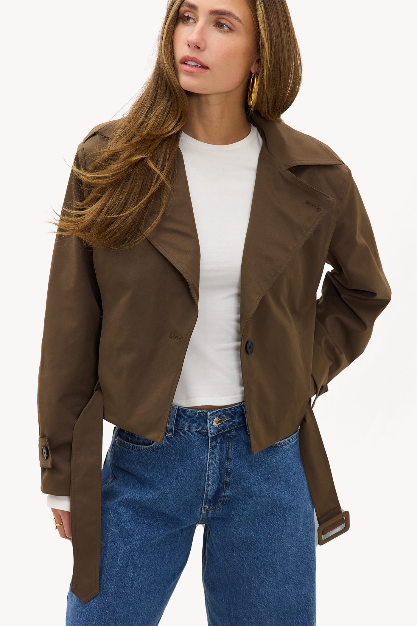Trench corto marrón 59,99 €Esta gabardina marrón tiene un ajuste corto y recortado con detalles plisados llamativos en la parte inferior. El cierre clásico de doble botonadura con cinturón crea una forma entallada. Las solapas sobredimensionadas y las proporciones modernas le dan a este abrigo un giro actualizado al diseño atemporal de la gabardina. Combina este abrigo con botas altas para un look urbano chic.