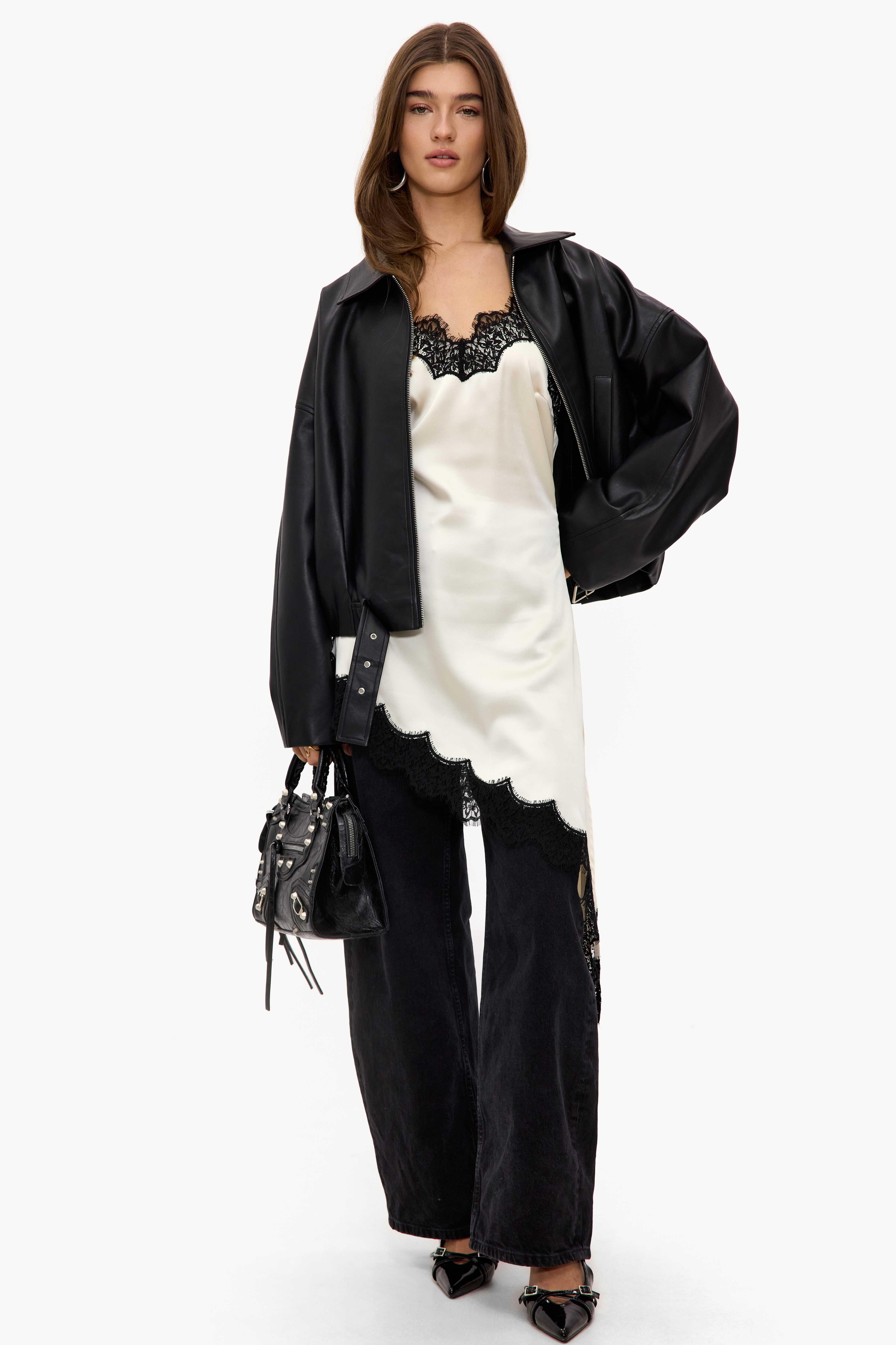 Este vestido lencero blanco roto presenta llamativos detalles de encaje negro para un contraste lujoso. El dobladillo asimétrico con un delicado ribete de encaje crea un giro moderno en el diseño clásico de lencería. Los tirantes finos y el ajuste ceñido acentúan elegantemente la forma. Combina este vestido con pendientes llamativos para una apariencia de cita para cenar.
