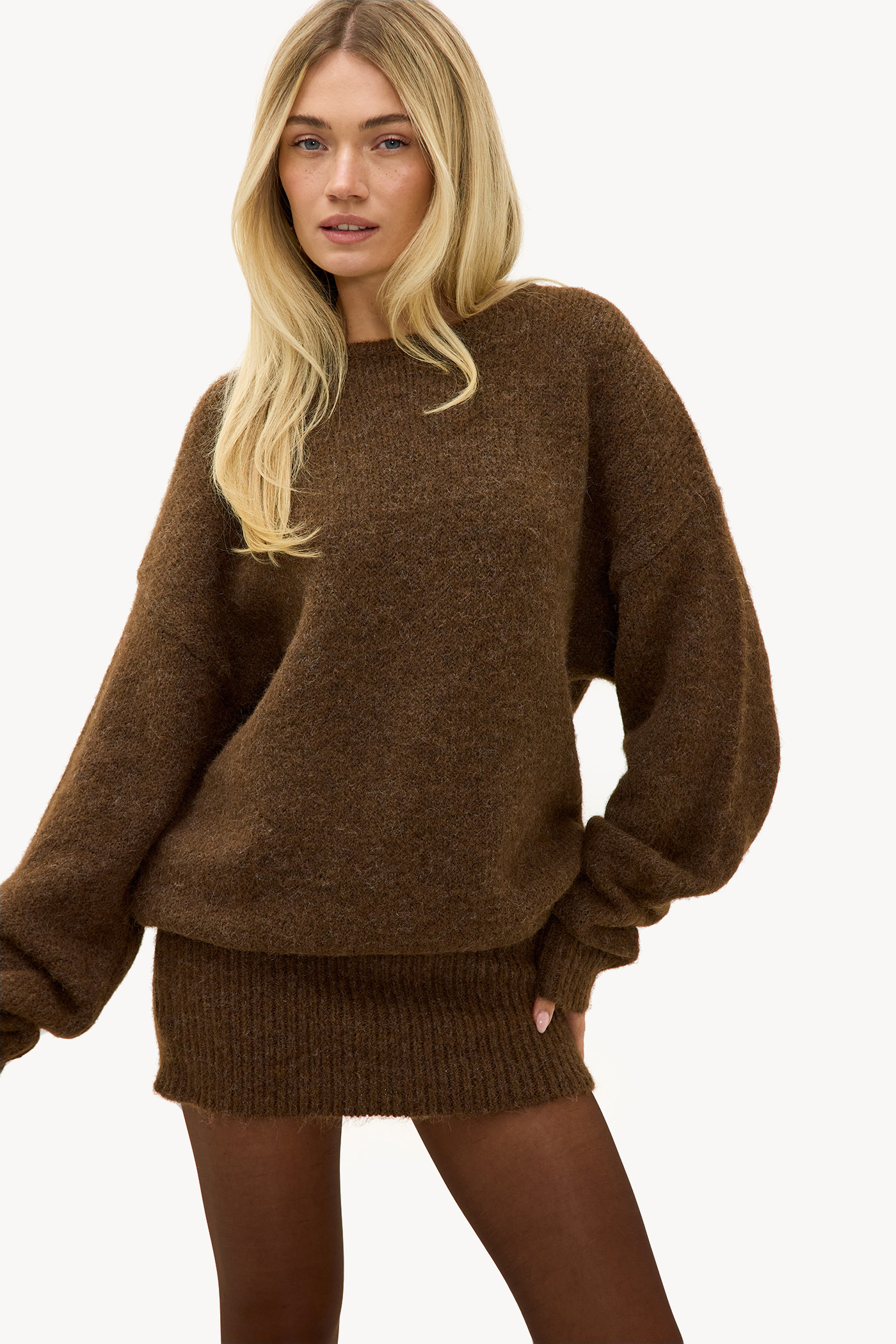 Este vestido de punto marrón cuenta con una calidad de mezcla de lana lujosa para un ajuste cálido y cómodo. El ajuste oversize con mangas abullonadas llamativas crea un look casual y fresco. Los detalles del dobladillo acanalado le dan a este vestido suéter un giro chic. Combina este vestido con botas altas para un look invernal impresionante.