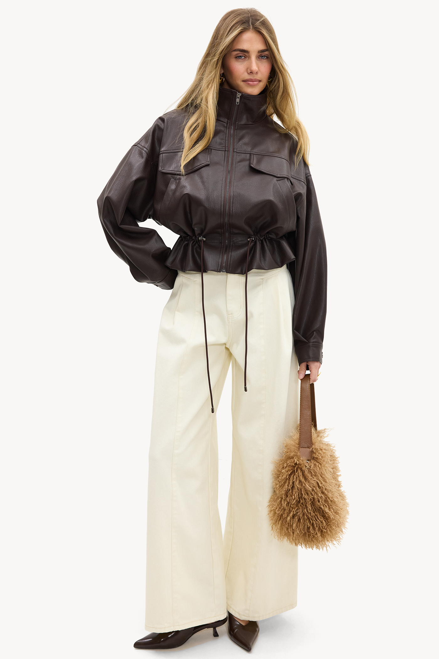 Vaqueros anchos en color crudo 59,99 €Estos pantalones de pierna ancha color crudo tienen un ajuste de cintura alta con piernas anchas de declaración para un look chic. El estilo de 5 bolsillos y la calidad del algodón aseguran comodidad y una apariencia lujosa. El ajuste extra ancho crea un giro moderno en el diseño clásico de mezclilla. Combina estos pantalones con un top corto y botas puntiagudas para un conjunto de moda.