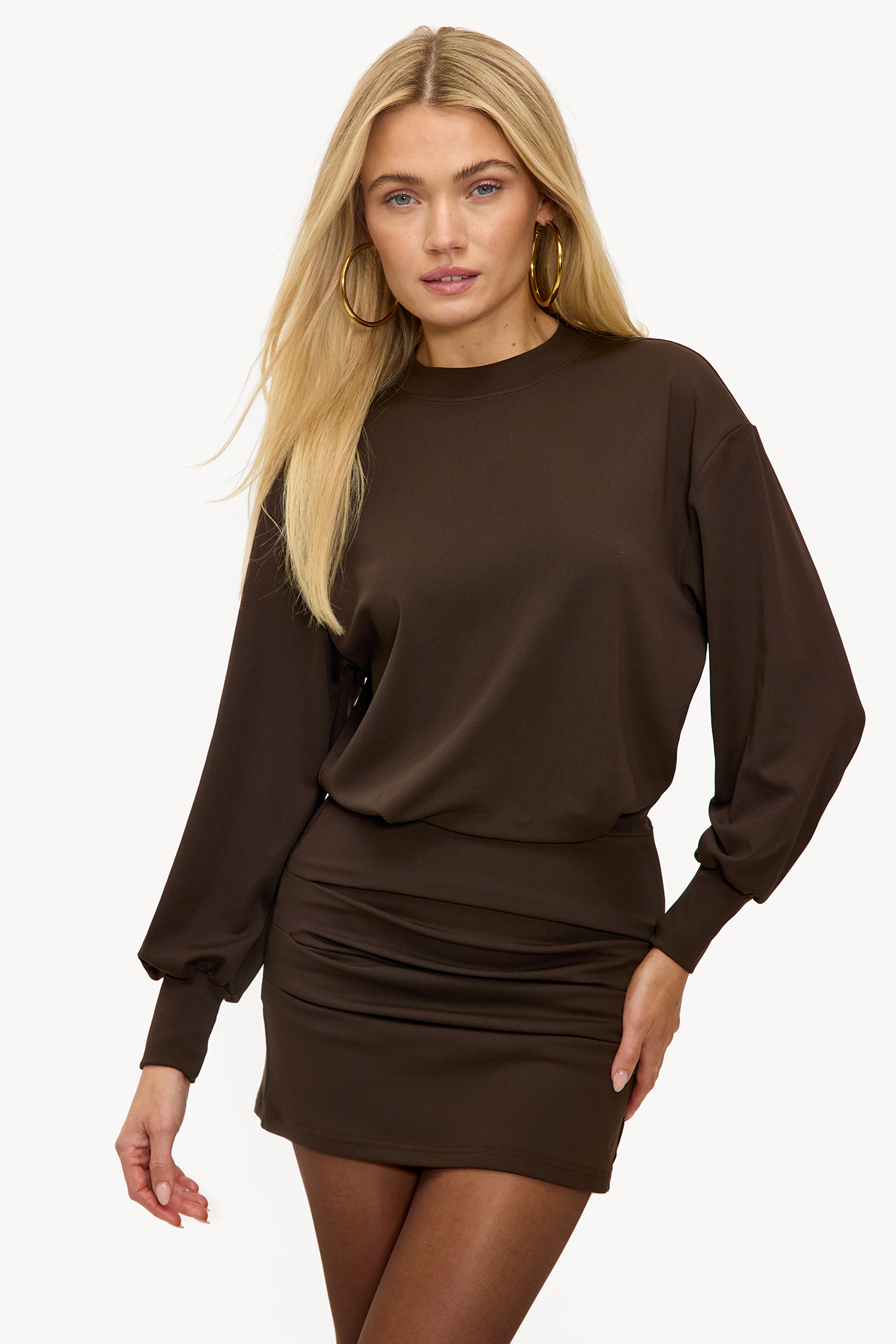 Este vestido mini marrón chocolate presenta un top relajado y holgado con una falda drapeada para un contraste fresco. La calidad de jersey suave con elasticidad asegura comodidad y libertad de movimiento. Las mangas largas con puños acanalados dan a este diseño un aspecto casual y chic. Combina este vestido con botas hasta la rodilla para un look invernal llamativo.