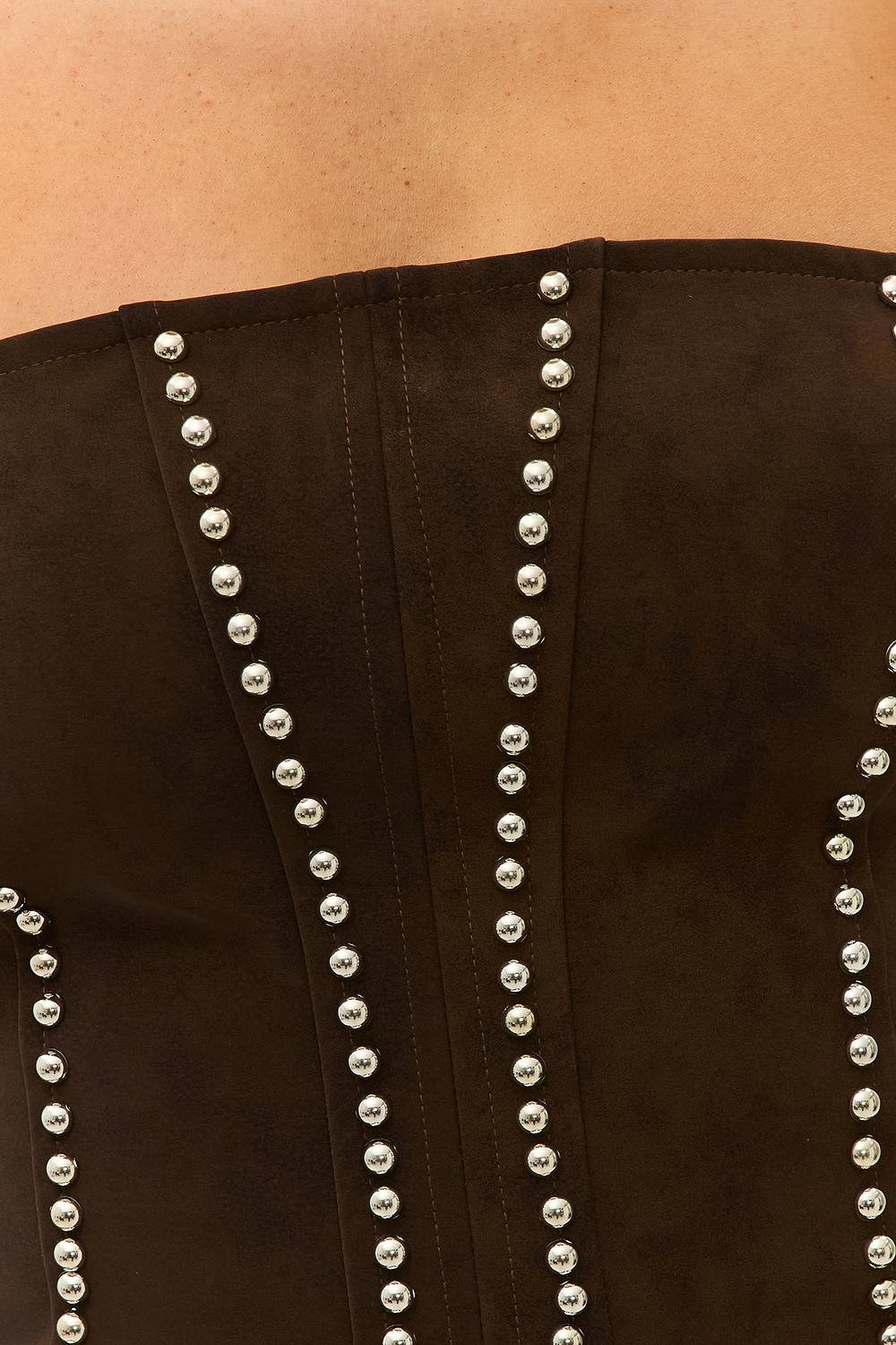 Este mini vestido marrón de imitación de ante presenta tachuelas llamativas en un patrón geométrico para un look atrevido. El ajuste ceñido sin tirantes acentúa la forma y crea una apariencia de declaración. La textura de ante lujosa con detalles de tachuelas colocadas estratégicamente le da a este vestido un ambiente rock-chic. Combina este vestido con botas vaqueras y joyas llamativas para un look listo para el festival.