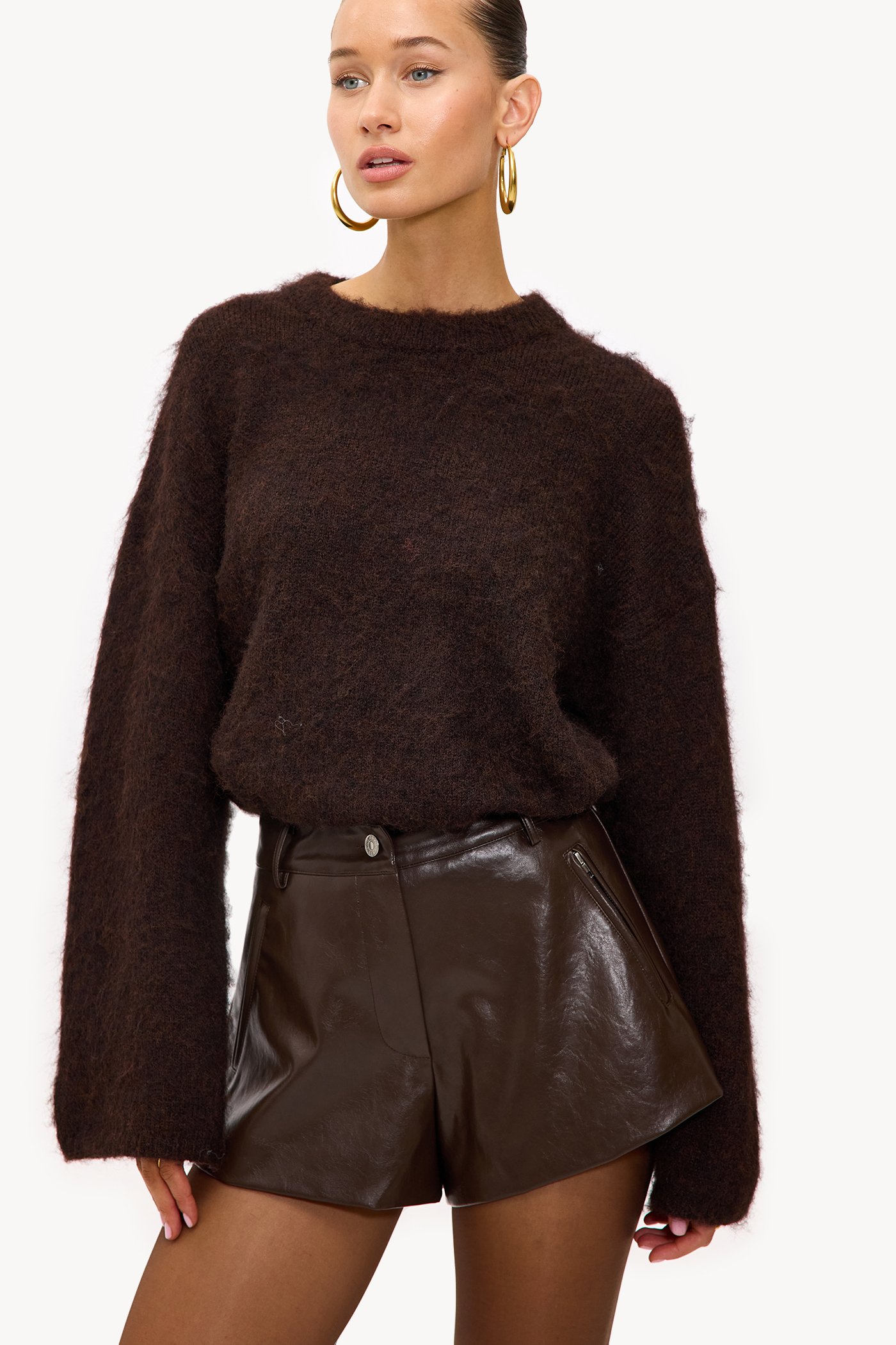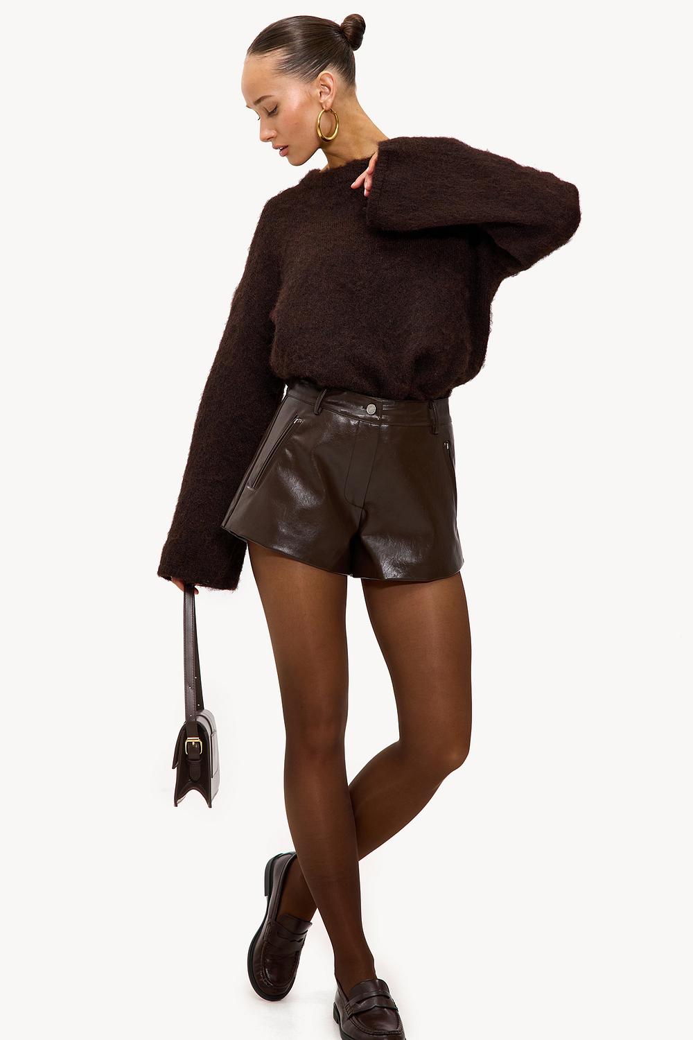 Estos shorts de aspecto cuero marrón tienen un ajuste de cintura alta con un cierre de botón plateado llamativo. El ajuste corto con detalles de cremallera sutiles en los lados crea un look atrevido. Combina estos shorts con un top transparente para un conjunto audaz para una noche de chicas.