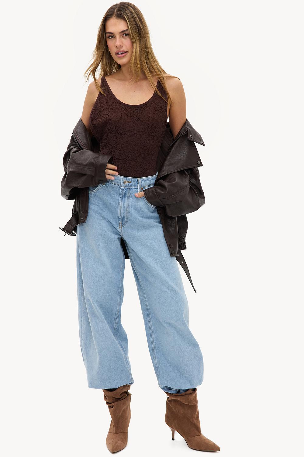 Body marrón con encaje. 19,99 €Este body de encaje marrón presenta un diseño de encaje lujoso para un look llamativo. El ajuste ceñido con una espalda abierta profunda y tirantes finos crea un giro moderno. La calidad elástica asegura comodidad y un ajuste perfecto. Combina este body con jeans de pierna ancha y un blazer oversize para un look casual chic.