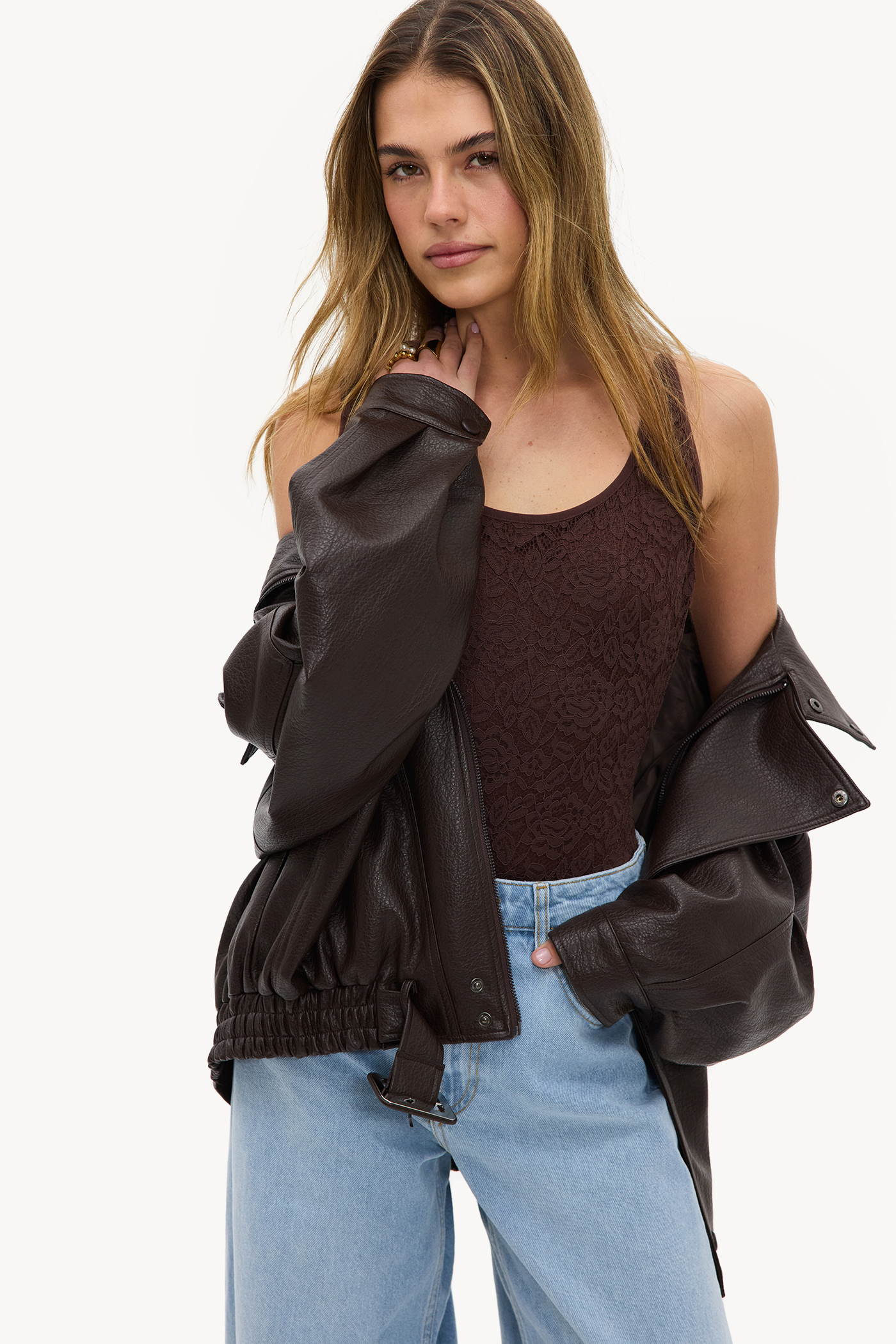 Body marrón con encaje. 19,99 €Este body de encaje marrón presenta un diseño de encaje lujoso para un look llamativo. El ajuste ceñido con una espalda abierta profunda y tirantes finos crea un giro moderno. La calidad elástica asegura comodidad y un ajuste perfecto. Combina este body con jeans de pierna ancha y un blazer oversize para un look casual chic.
