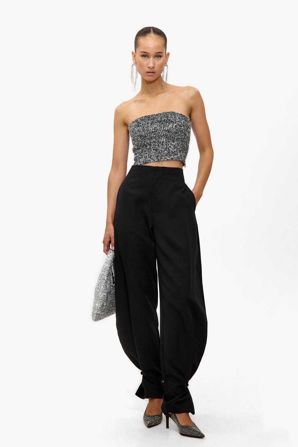 Top bandeau negro con hilo lurex plateado 35,99 €Este top corto plateado sin tirantes presenta una textura suave de lúrex con un efecto brillante para un look llamativo. El ajuste estilo bandeau con una banda elástica garantiza un ajuste cómodo. La longitud recortada crea una forma moderna que combina perfectamente con pantalones de cintura alta. Combina este top con pantalones anchos negros para una noche de chicas elegante.