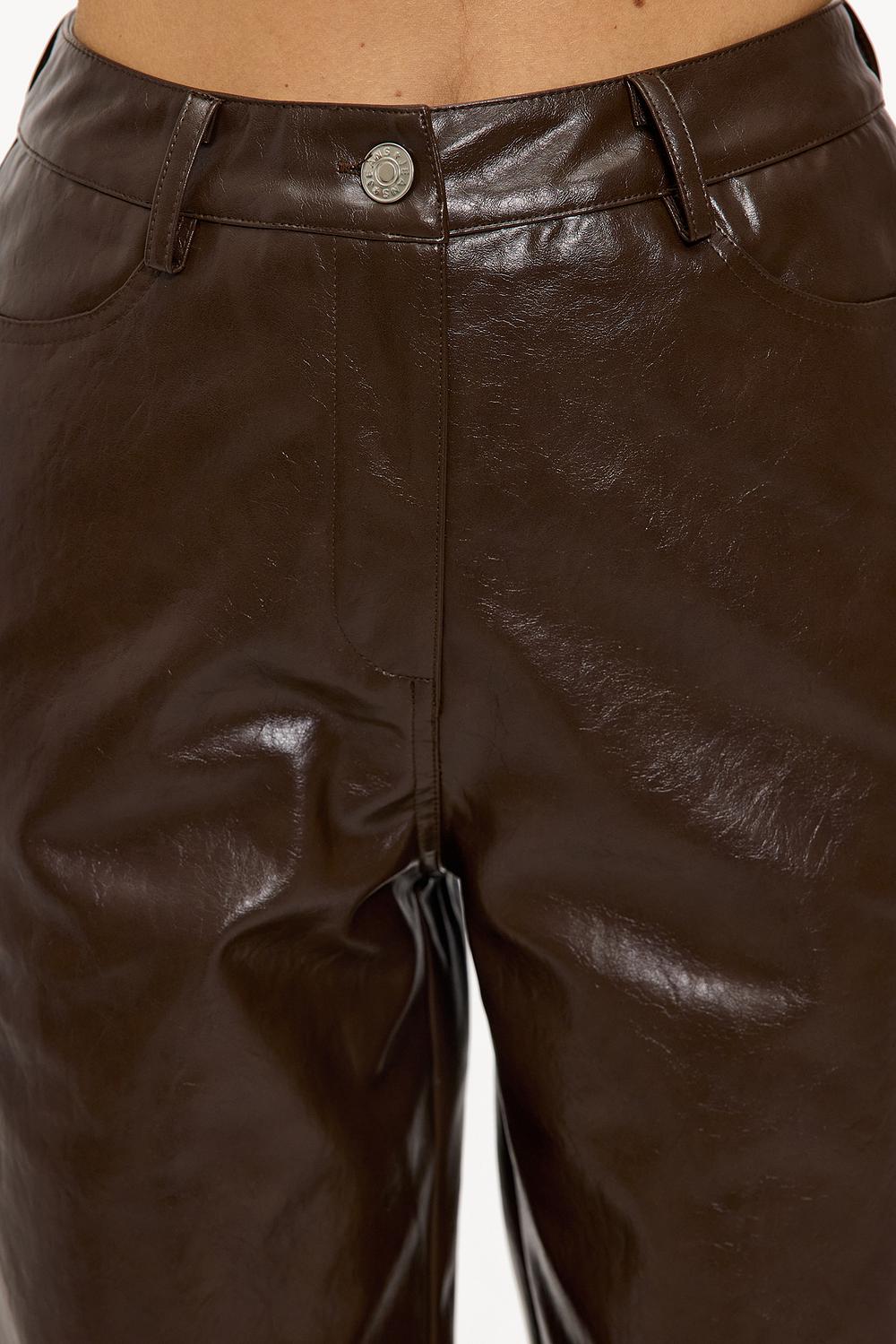 Estos pantalones rectos de color marrón oscuro tienen un acabado lujoso con efecto cuero para un look llamativo. El estilo de 5 bolsillos con cierre de botón clásico y piernas rectas crea un giro moderno en el diseño atemporal. El ajuste de cintura alta acentúa la forma de manera elegante. Combina estos pantalones con un suéter a rayas para un look casual y fresco.