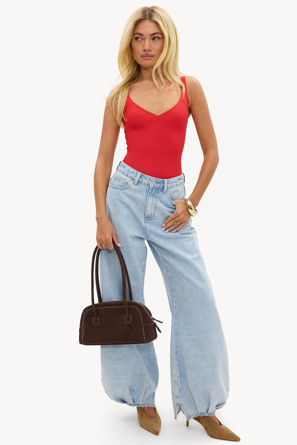 Este body rojo presenta un escote en V profundo y tirantes finos para un look elegante. El ajuste ceñido acentúa perfectamente la forma y la calidad de estiramiento suave asegura un confort óptimo. Combina este body con unos jeans de cintura alta para un look casual de día o con una mini falda para una cita para cenar.
