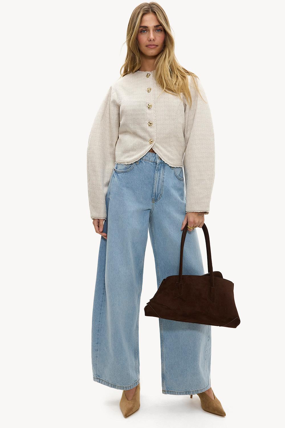 Blazer bouclé beige con detalles sutiles de lentejuelas 69,99 €Este cárdigan de bouclé color arena presenta botones dorados para un toque lujoso. La tela texturizada y el ajuste relajado crean un look casual y chic. El cierre de botones en la parte delantera y la textura suave de bouclé le dan a este cárdigan una actualización moderna. Combina este cárdigan con jeans de pierna ancha para un look de oficina sin esfuerzo.