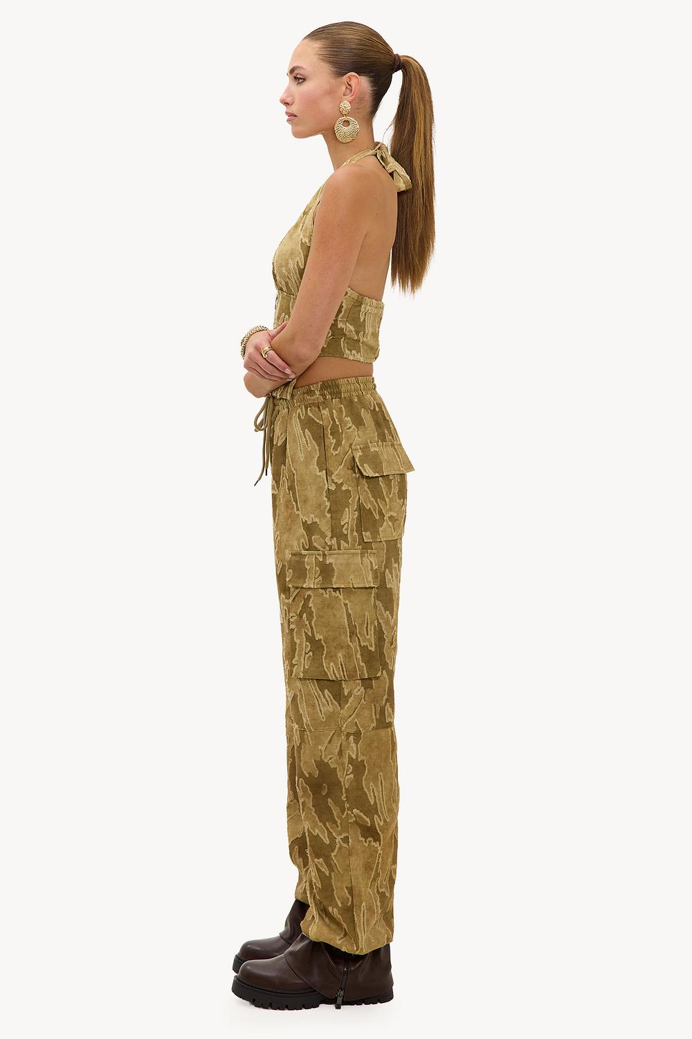 Pantalón cargo verde con estampado camuflaje 49,99 €Estos pantalones cargo marrones presentan un llamativo estampado de camuflaje en tonos tierra para un look militar atrevido. El ajuste de pierna ancha con cintura elástica y cordón asegura comodidad y un ajuste relajado. Los bolsillos cargo prácticos y los detalles llamativos le dan a estos pantalones un toque resistente. Combina estos pantalones cargo con un crop top y botas gruesas para un conjunto listo para el festival.