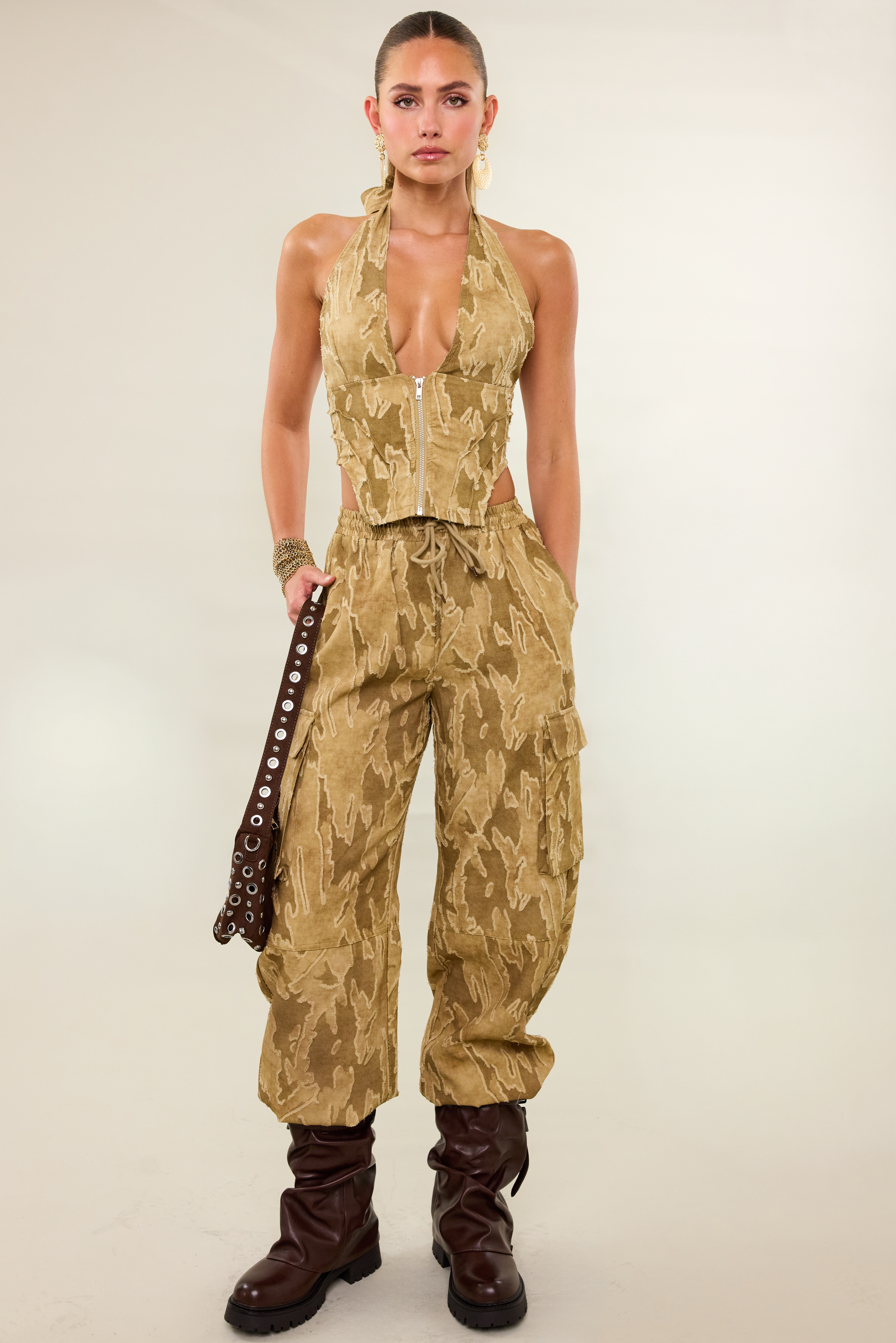 Estos pantalones cargo marrones presentan un llamativo estampado de camuflaje en tonos tierra para un look militar atrevido. El ajuste de pierna ancha con cintura elástica y cordón asegura comodidad y un ajuste relajado. Los bolsillos cargo prácticos y los detalles llamativos le dan a estos pantalones un toque resistente. Combina estos pantalones cargo con un crop top y botas gruesas para un conjunto listo para el festival.