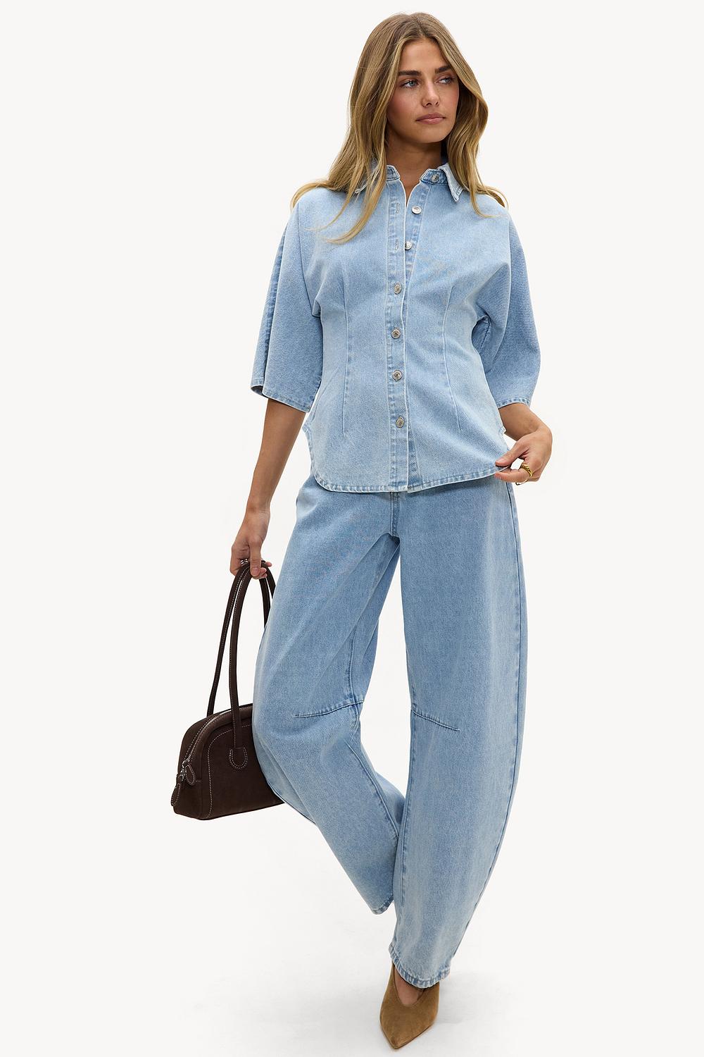 Blusa vaquera azul claro entallada 49,99 €Esta blusa de mezclilla azul claro tiene un ajuste holgado y relajado con mangas cortas para un look casual. El cierre de botones clásico en la parte delantera y el lavado sutil le dan a este diseño de mezclilla un toque moderno. La mezcla de algodón suave asegura comodidad y facilidad de uso. Combina esta blusa con los jeans de pierna ancha a juego para un impresionante look coordinado de mezclilla sobre mezclilla.