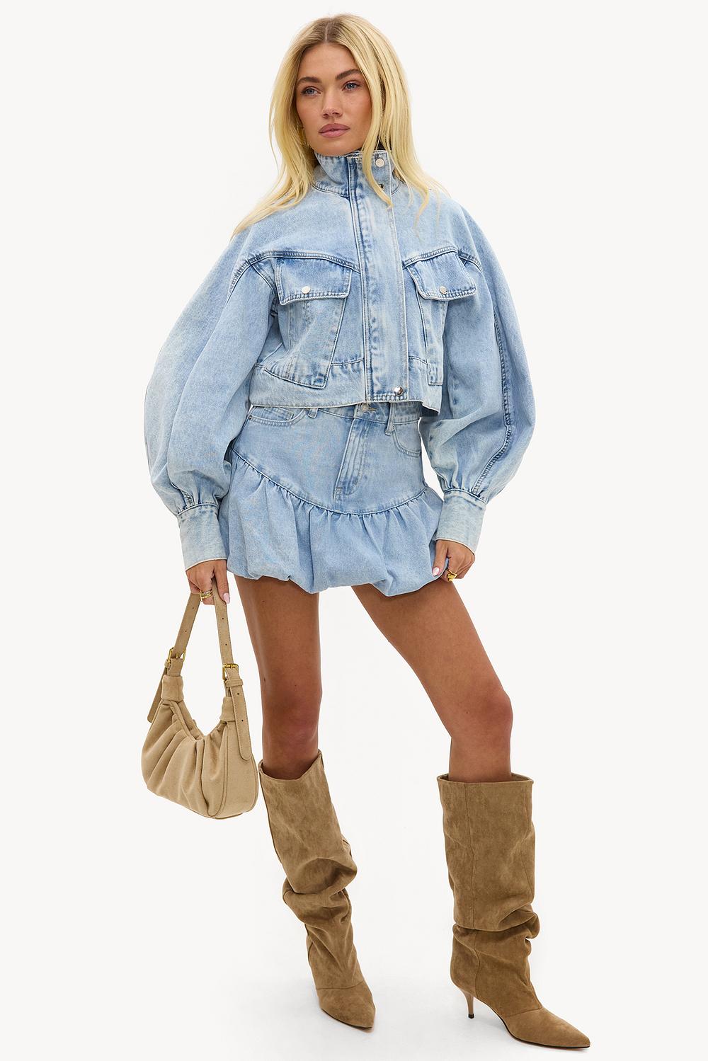 Esta chaqueta de mezclilla azul claro presenta llamativas mangas abullonadas y un ajuste recortado para un look llamativo. El ajuste oversize con costuras contrastantes y bolsillos utilitarios crea un giro moderno en el diseño clásico de mezclilla. El cuello alto con cierre de botones y los puños elásticos añaden detalles adicionales. Combina esta chaqueta con la falda pantalón de mezclilla a juego para un look coordinado completo de mezclilla.