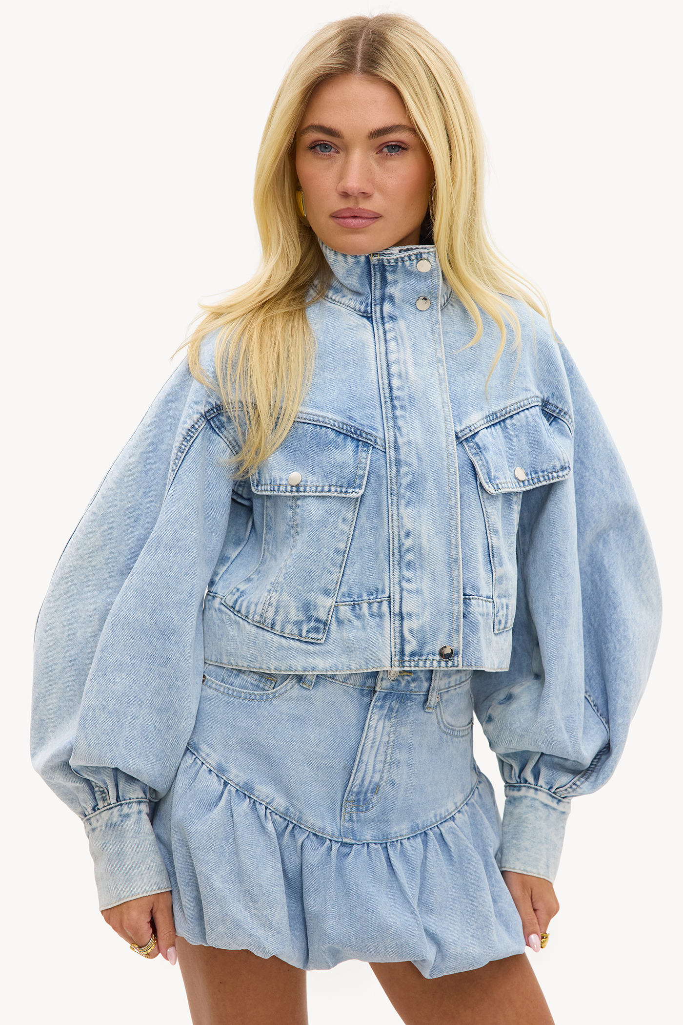 Esta chaqueta de mezclilla azul claro presenta llamativas mangas abullonadas y un ajuste recortado para un look llamativo. El ajuste oversize con costuras contrastantes y bolsillos utilitarios crea un giro moderno en el diseño clásico de mezclilla. El cuello alto con cierre de botones y los puños elásticos añaden detalles adicionales. Combina esta chaqueta con la falda pantalón de mezclilla a juego para un look coordinado completo de mezclilla.
