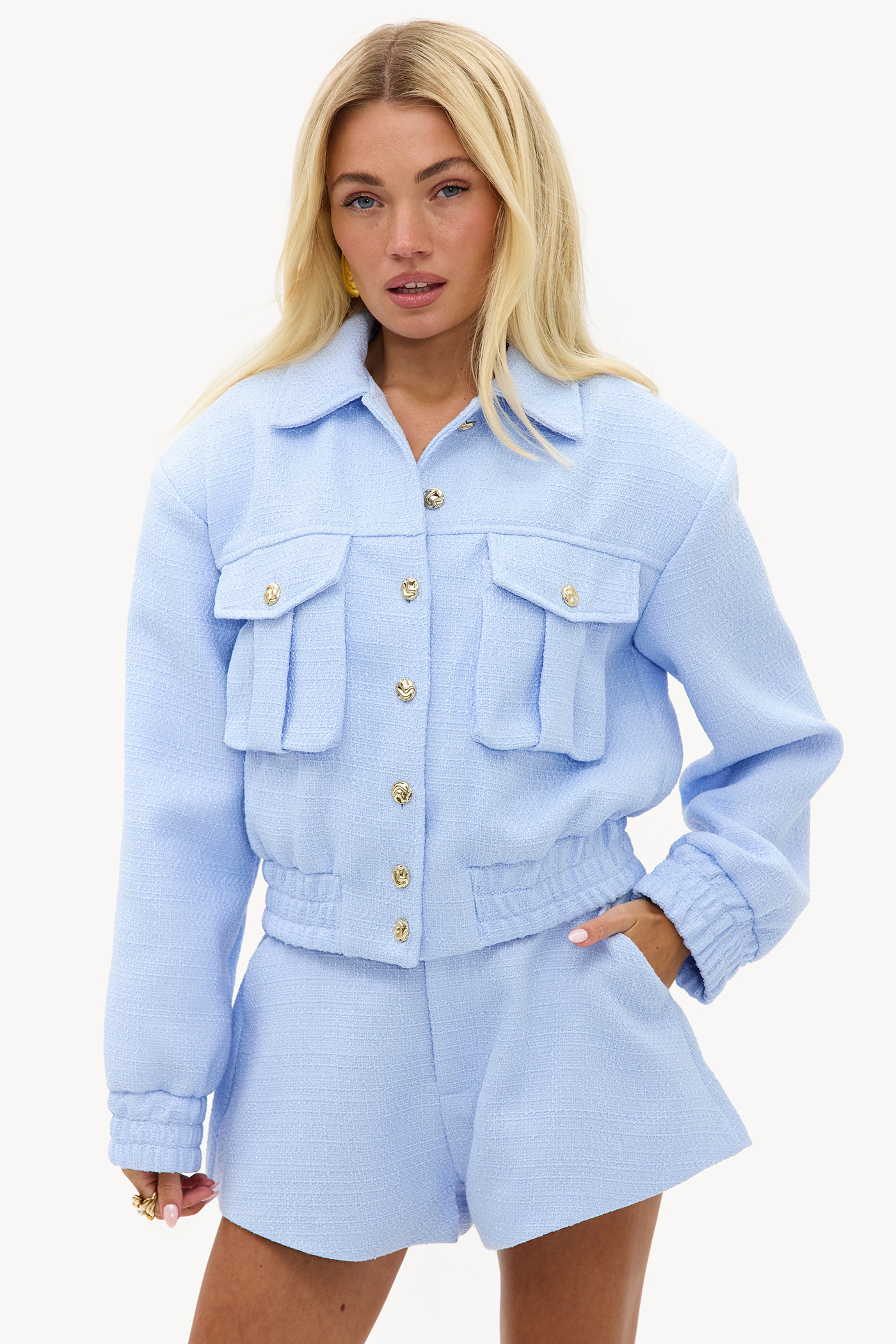 Esta chaqueta de bouclé azul claro presenta un ajuste recortado con botones dorados llamativos y bolsillos en el pecho de inspiración utilitaria. La textura suave del bouclé ofrece un giro moderno al diseño clásico de la chaqueta. Combina esta chaqueta con los shorts a juego para un look coordinado chic.