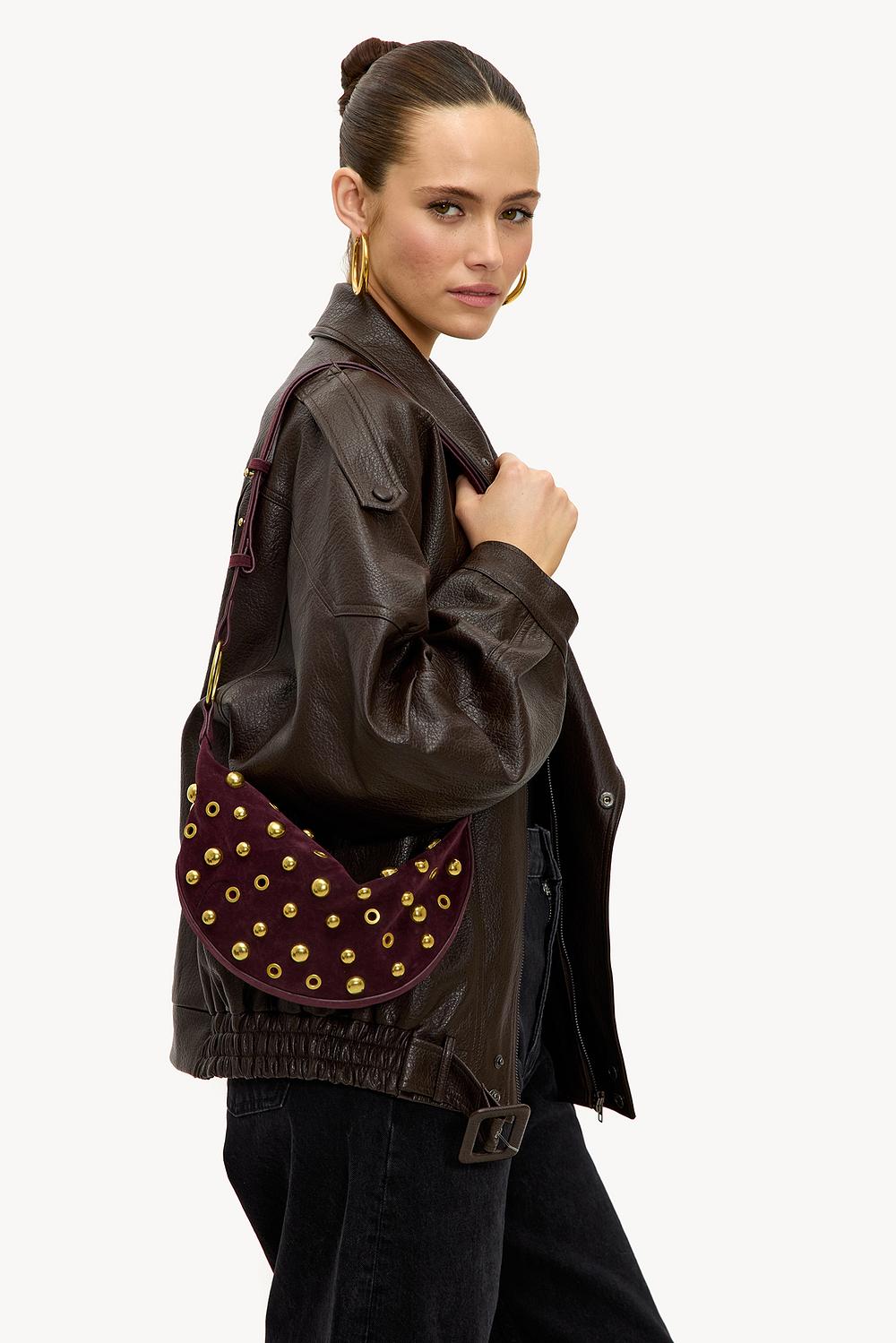 Este bolso bandolera burdeos tiene una forma de media luna curvada con llamativos tachuelas doradas por todas partes. La correa ajustable y la forma compacta hacen que este bolso sea perfecto para un estilo manos libres. Los detalles metálicos dan un acabado lujoso al diseño. Combina este bolso llamativo con una chaqueta de cuero oversize para un look urbano atrevido.