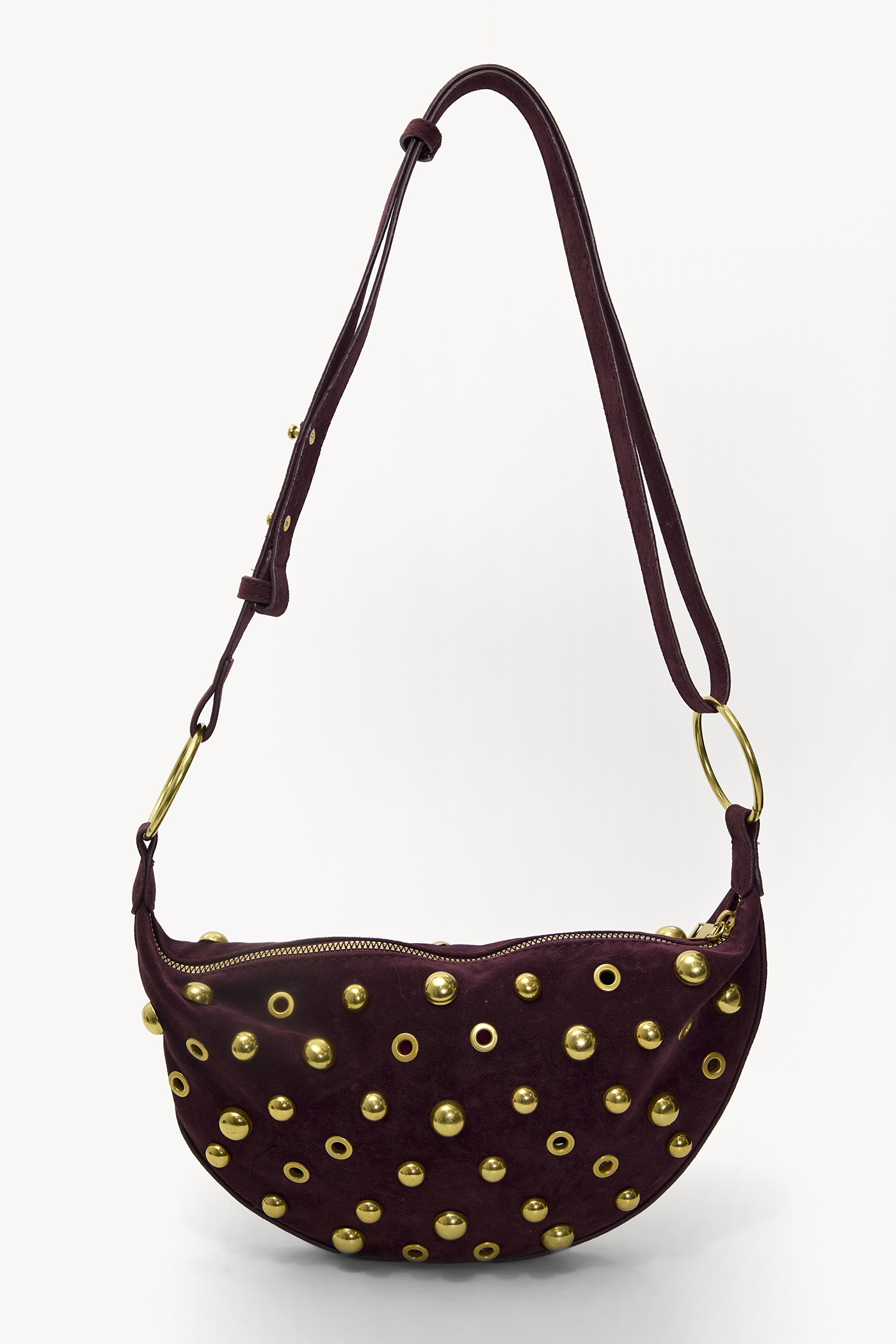 Este bolso bandolera burdeos tiene una forma de media luna curvada con llamativos tachuelas doradas por todas partes. La correa ajustable y la forma compacta hacen que este bolso sea perfecto para un estilo manos libres. Los detalles metálicos dan un acabado lujoso al diseño. Combina este bolso llamativo con una chaqueta de cuero oversize para un look urbano atrevido.