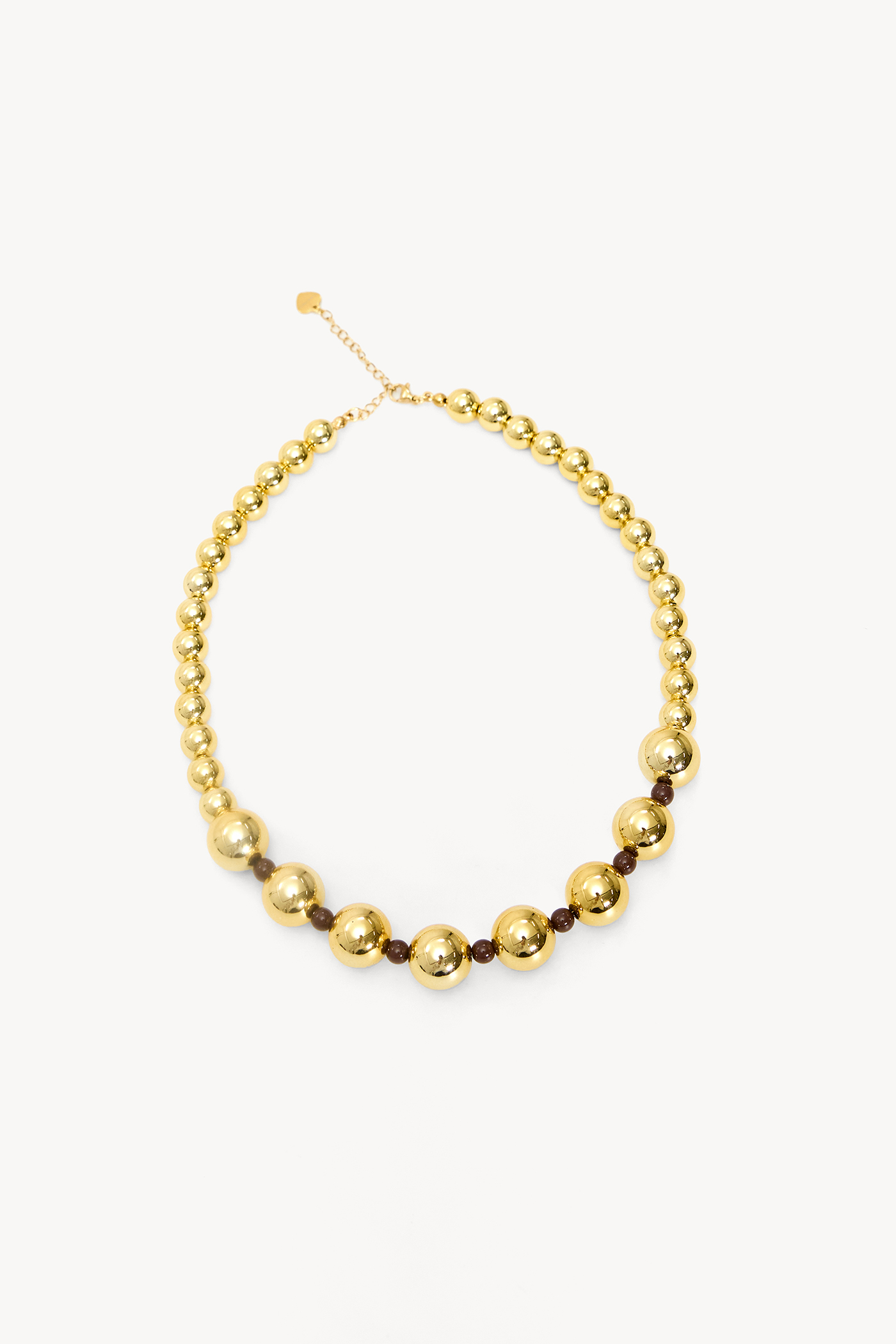 Collar dorado con cuentas marrones. 14,99 €Este collar dorado de declaración presenta llamativas cuentas graduadas para un look lujoso. La calidad de acero inoxidable chapado en oro asegura durabilidad y un hermoso brillo. El cierre ajustable hace que este collar sea perfecto para diferentes escotes. Combina este collar con un blazer a medida para un look de oficina elegante.