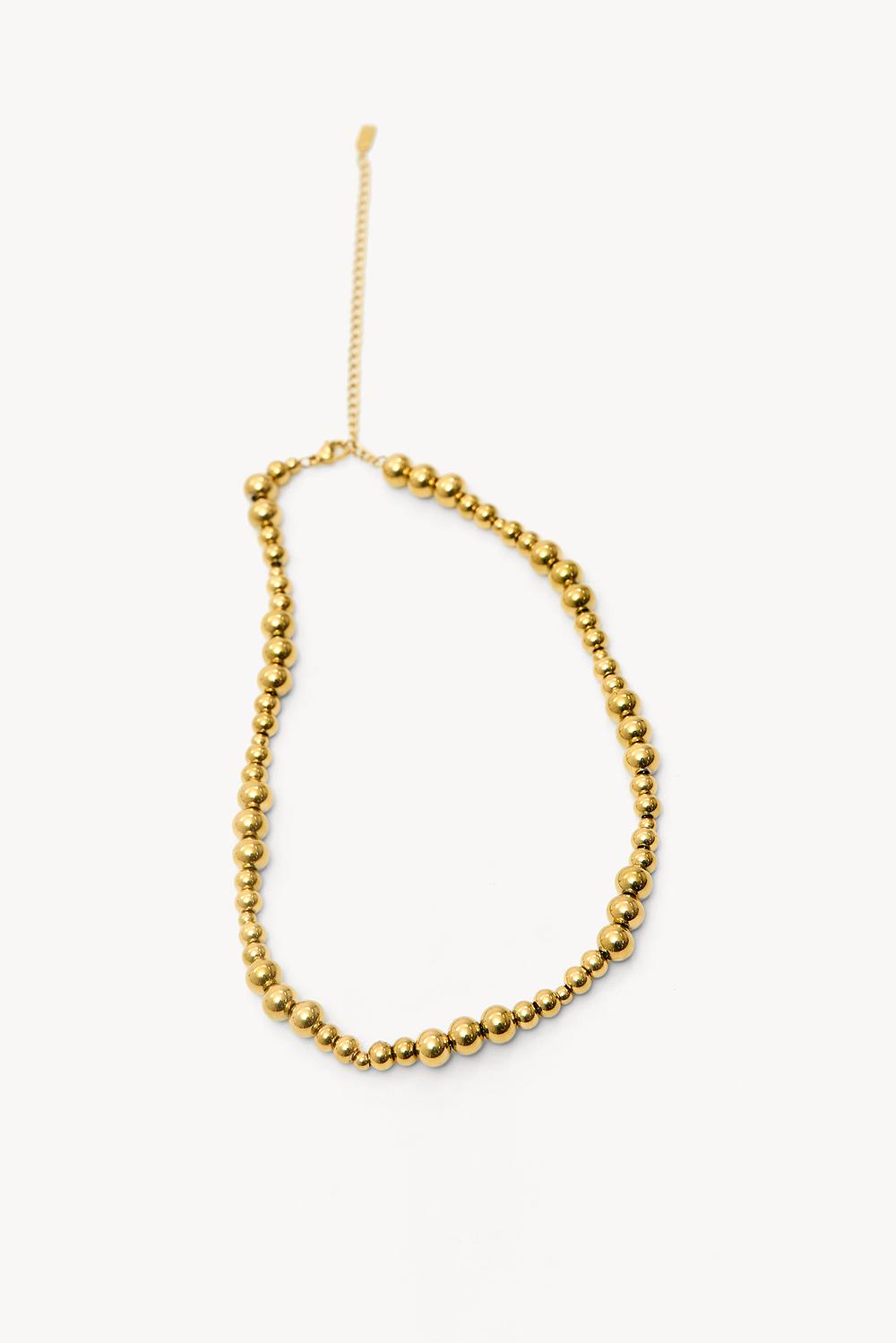 Este collar dorado de declaración presenta un diseño de cuentas llamativo con cuentas redondas para un aspecto lujoso. La cadena ajustable de acero inoxidable 100% chapado en oro asegura durabilidad y un hermoso brillo. Las cuentas gruesas le dan a este collar un giro moderno que complementa perfectamente tanto los atuendos casuales como los elegantes.