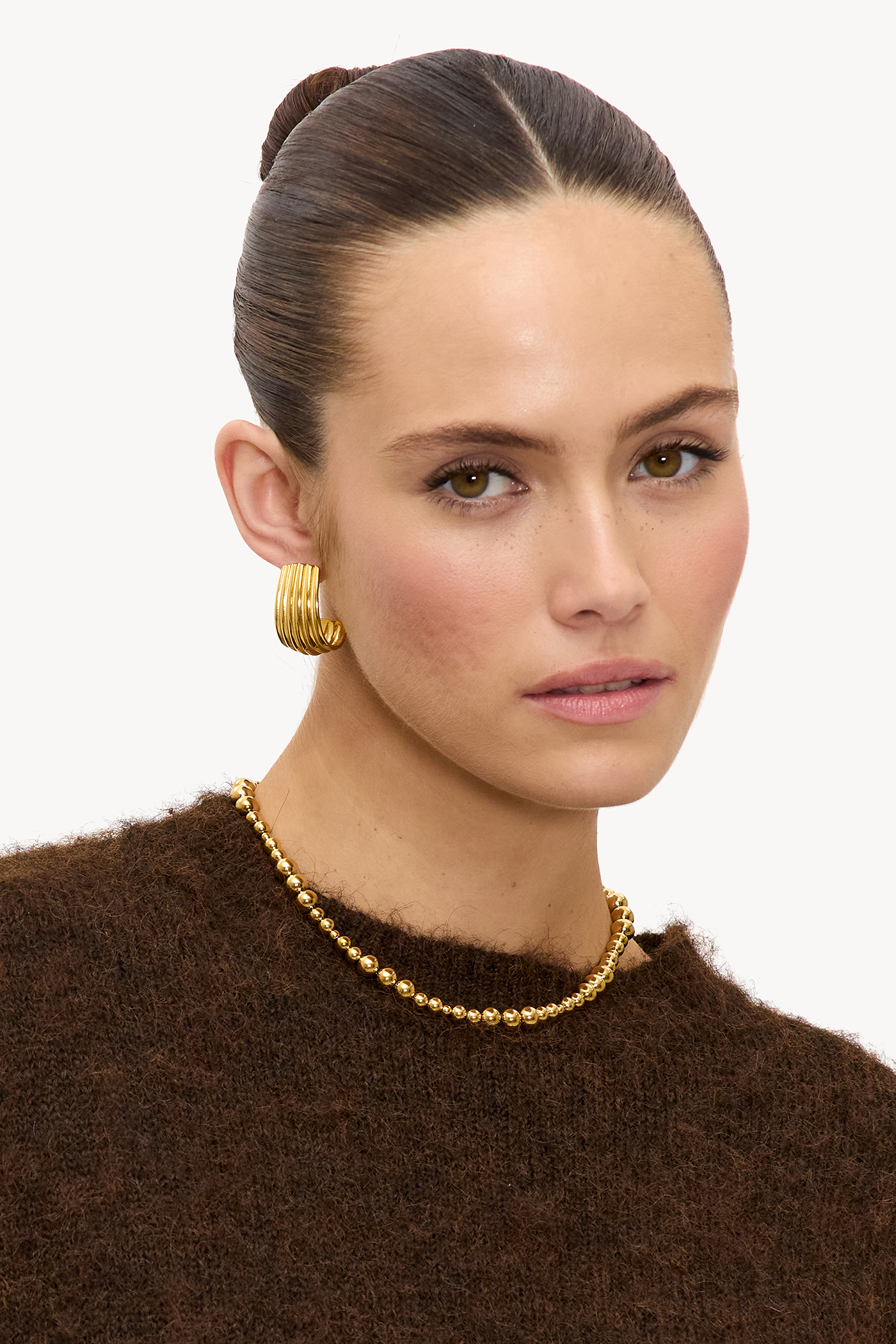 Este collar dorado de declaración presenta un diseño de cuentas llamativo con cuentas redondas para un aspecto lujoso. La cadena ajustable de acero inoxidable 100% chapado en oro asegura durabilidad y un hermoso brillo. Las cuentas gruesas le dan a este collar un giro moderno que complementa perfectamente tanto los atuendos casuales como los elegantes.