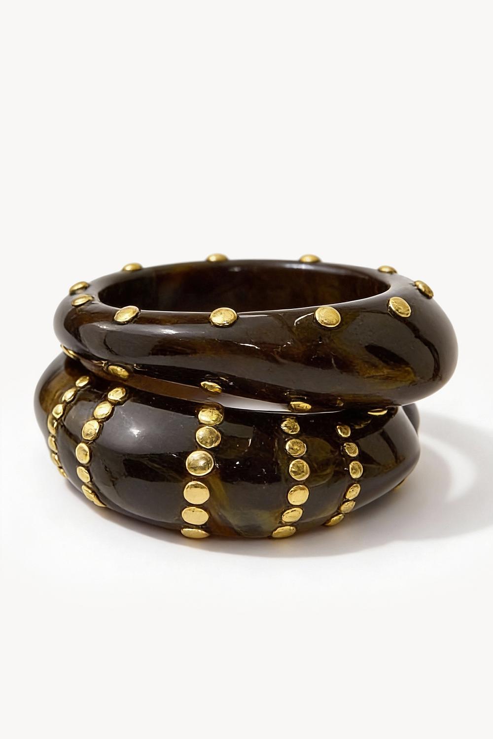 Este conjunto de pulseras statement presenta llamativos tachones dorados sobre bandas negras para un look atrevido. La mezcla de plástico y acero inoxidable chapado en oro asegura un acabado lujoso con una actitud rock-chic. El ajuste ancho crea un acento audaz en tu muñeca. Estiliza estas pulseras con un blazer oversize y jeans rectos para un look de contraste fresco.