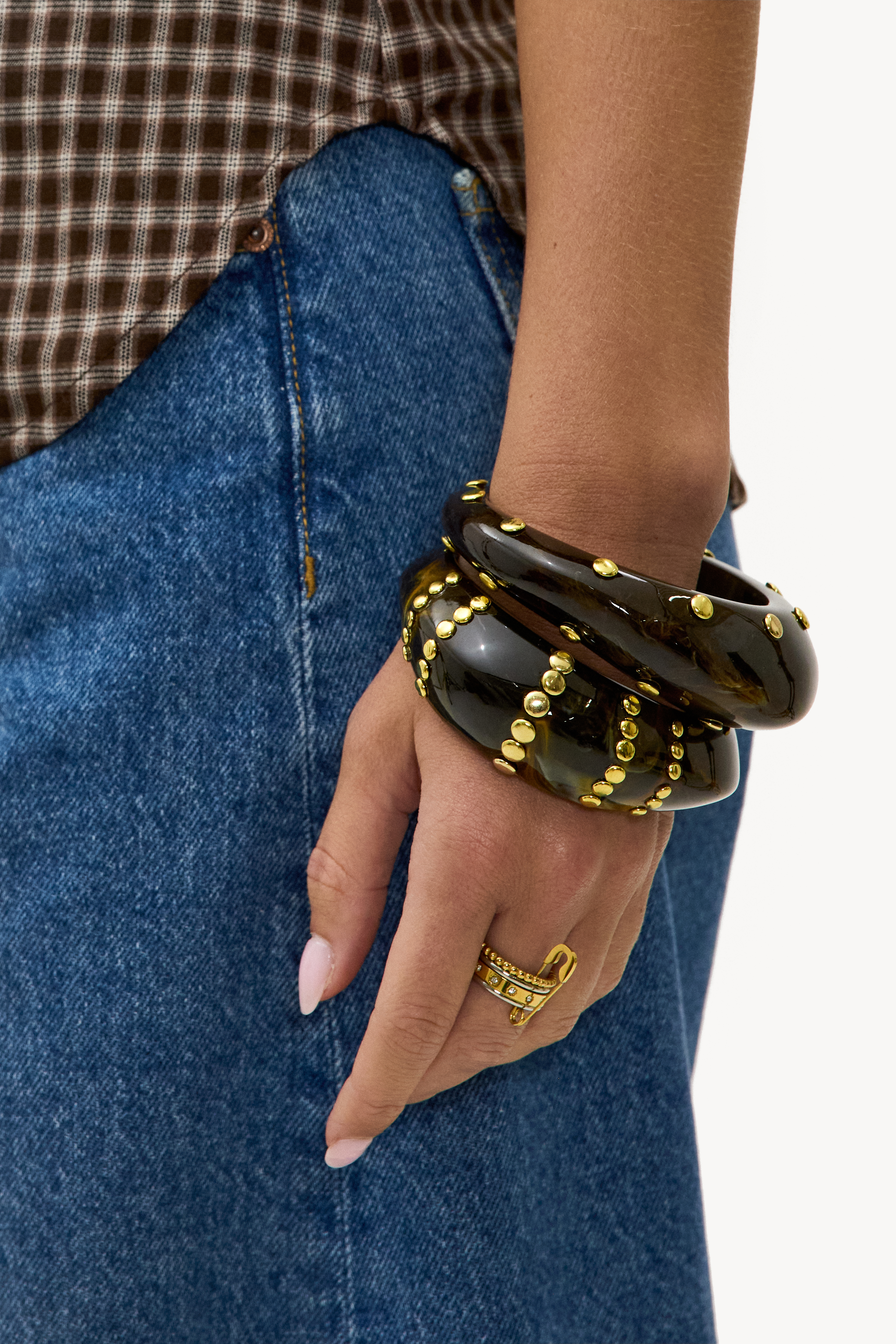 Este conjunto de pulseras statement presenta llamativos tachones dorados sobre bandas negras para un look atrevido. La mezcla de plástico y acero inoxidable chapado en oro asegura un acabado lujoso con una actitud rock-chic. El ajuste ancho crea un acento audaz en tu muñeca. Estiliza estas pulseras con un blazer oversize y jeans rectos para un look de contraste fresco.