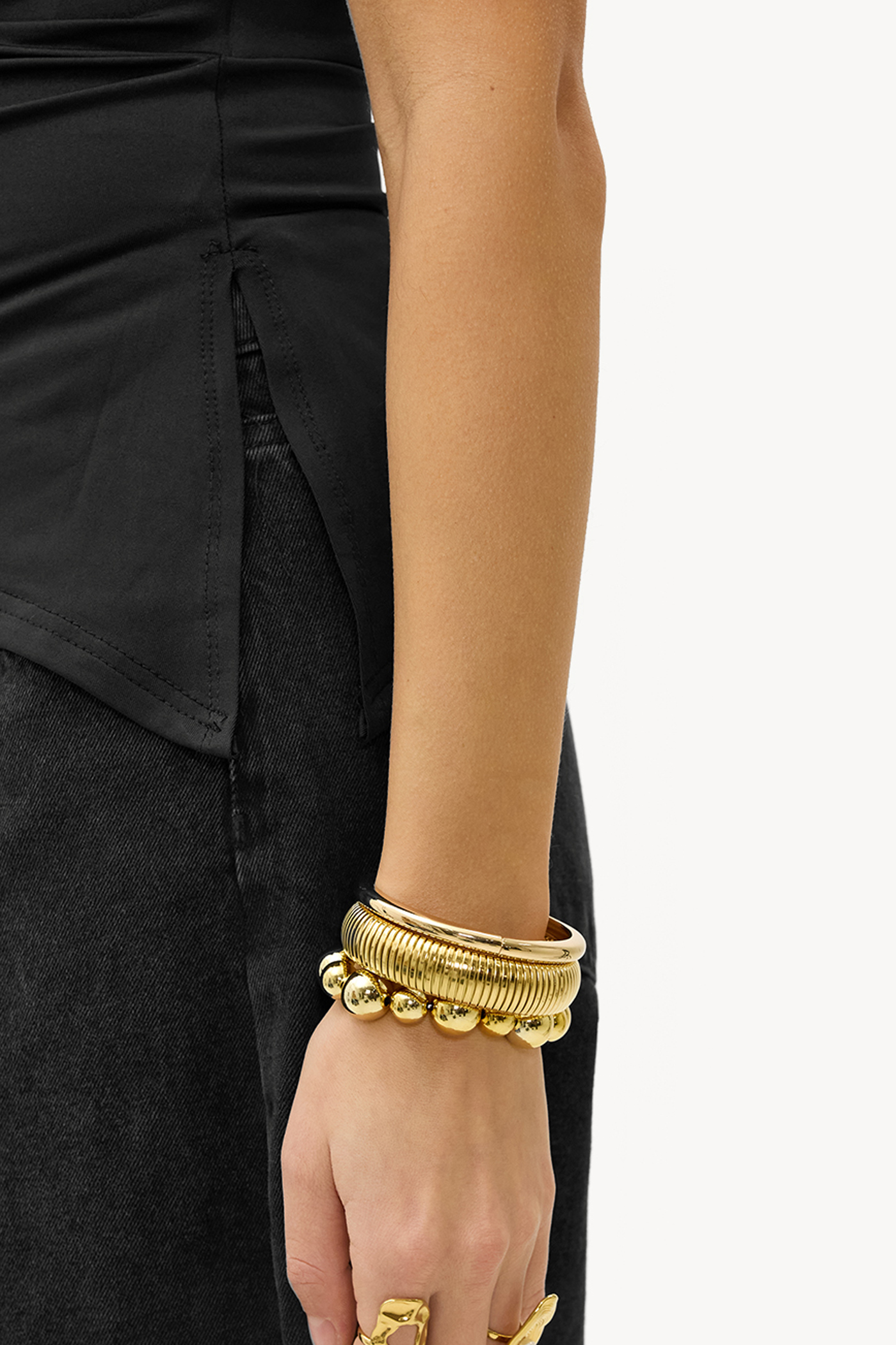Pulseras doradas 3-pack 19,99 €Este conjunto de pulseras doradas consta de dos pulseras llamativas con diferentes texturas. La primera pulsera tiene un diseño audaz con cuentas brillantes, mientras que la segunda presenta un patrón acanalado elegante. El acabado dorado le da a ambas pulseras un aspecto lujoso. Estiliza este conjunto junto para un look en capas o úsalas por separado para un toque sutil.