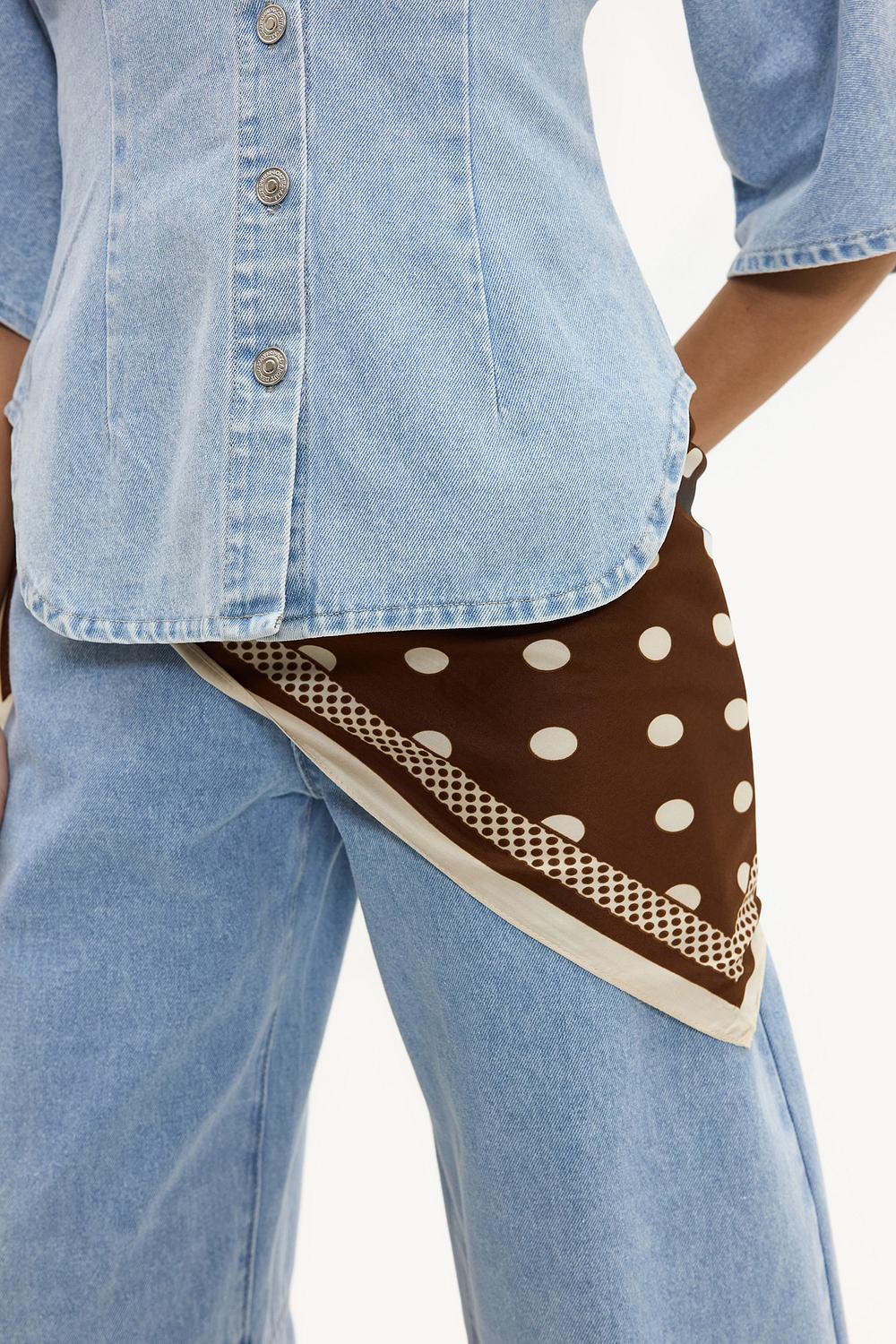 Esta bufanda marrón presenta un llamativo estampado de lunares grandes con detalles en crema para un look inspirado en el vintage. El diseño cuadrado con bordes contrastantes crea un accesorio llamativo que completa cualquier atuendo. La suave calidad del poliéster asegura comodidad y una apariencia lujosa. Estiliza esta bufanda de manera casual alrededor de tu cuello o como pañuelo para un look retro chic.