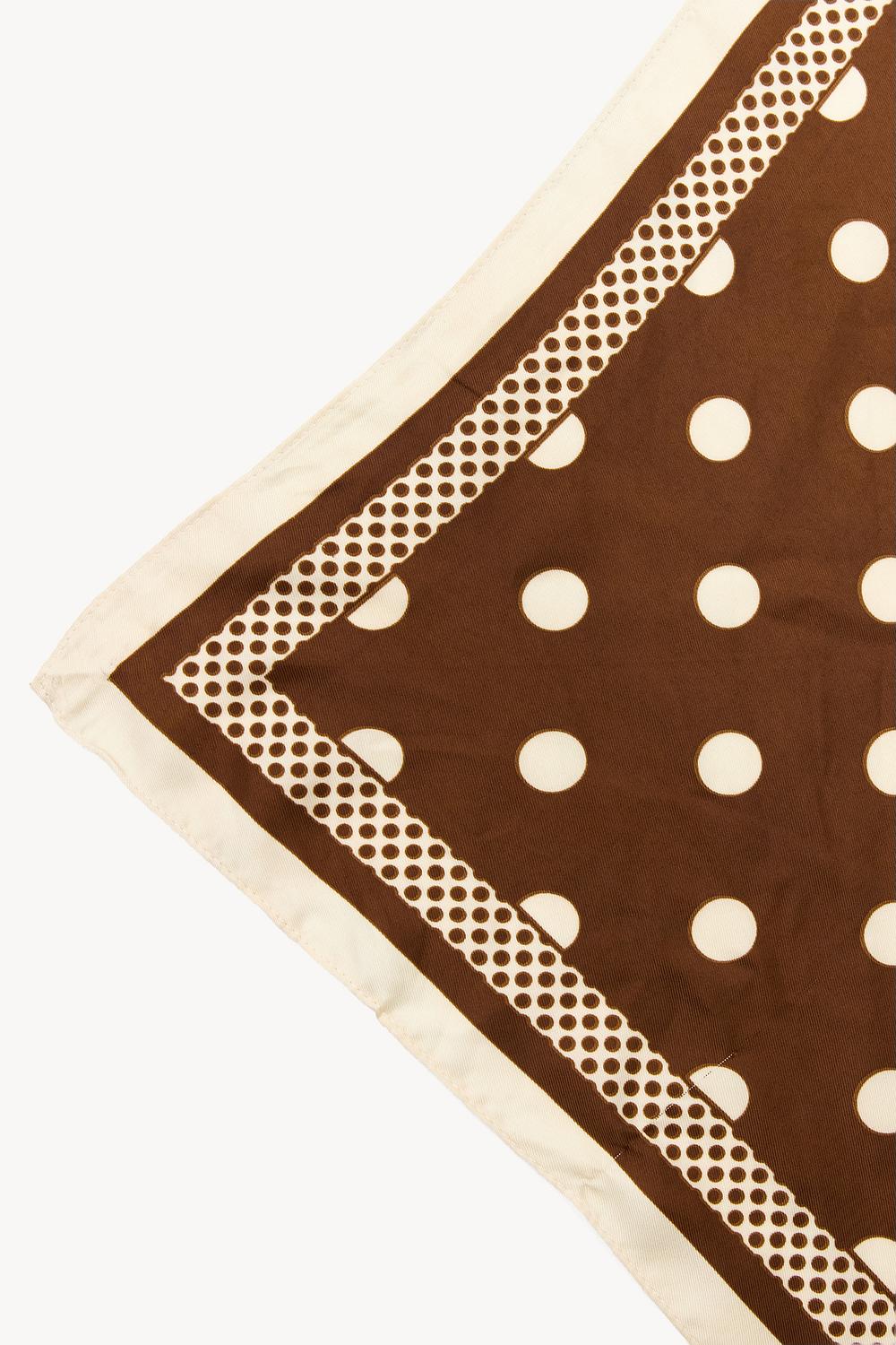 Esta bufanda marrón presenta un llamativo estampado de lunares grandes con detalles en crema para un look inspirado en el vintage. El diseño cuadrado con bordes contrastantes crea un accesorio llamativo que completa cualquier atuendo. La suave calidad del poliéster asegura comodidad y una apariencia lujosa. Estiliza esta bufanda de manera casual alrededor de tu cuello o como pañuelo para un look retro chic.