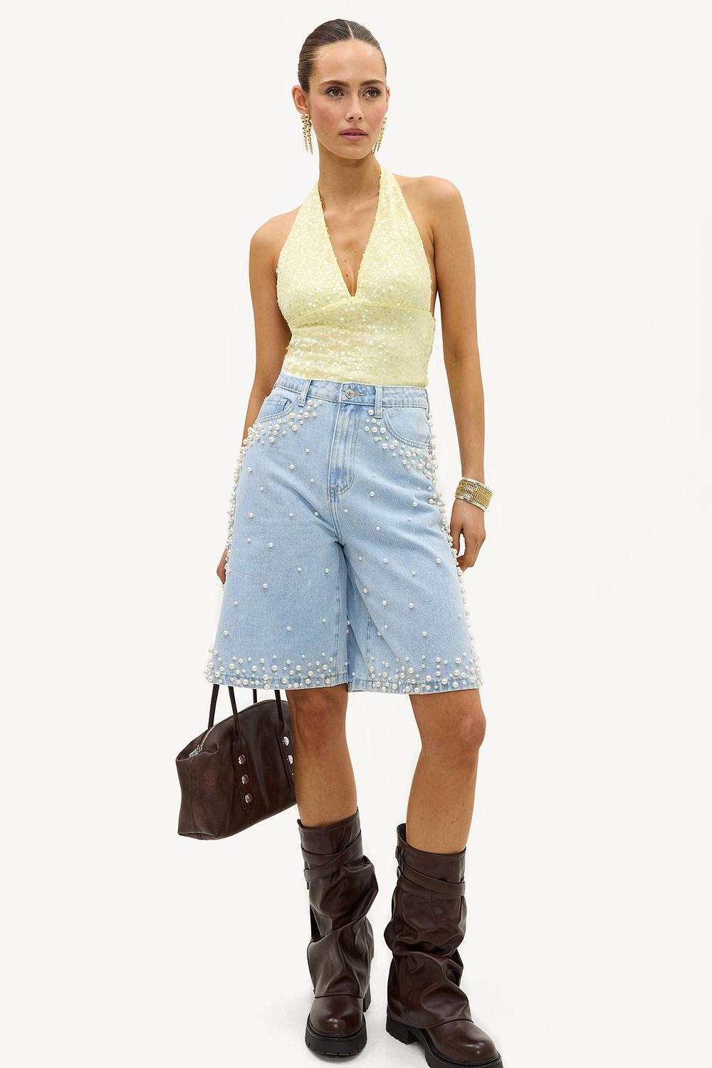 Camiseta sin mangas amarilla con lentejuelas 25,99 €Este top amarillo de cuello halter tiene lentejuelas por todas partes para un look brillante de declaración. El profundo escote en V y el diseño halter crean un ajuste sexy que acentúa perfectamente la forma. El ajuste ceñido asegura una apariencia chic que destaca de inmediato. Combina este top con una falda de mezclilla de cintura alta para un look de noche de chicas.