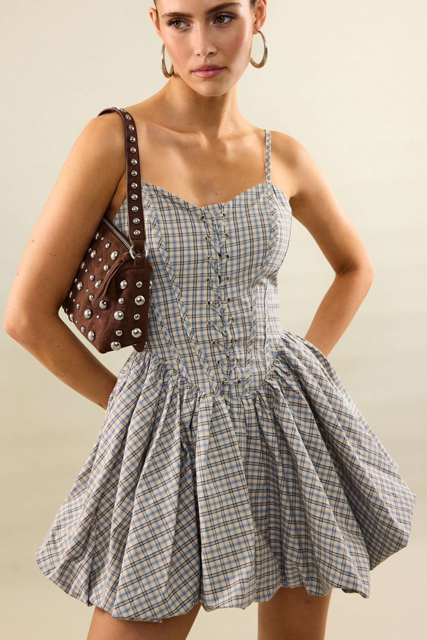Este vestido mini azul claro presenta un estampado de cuadros clásico con un toque moderno. El escote corazón y el cierre de botones en la parte delantera le dan un aspecto de inspiración vintage. El corte en línea A con cintura elástica acentúa perfectamente la figura. Combina este vestido con botas vaqueras para un look casual y fresco.