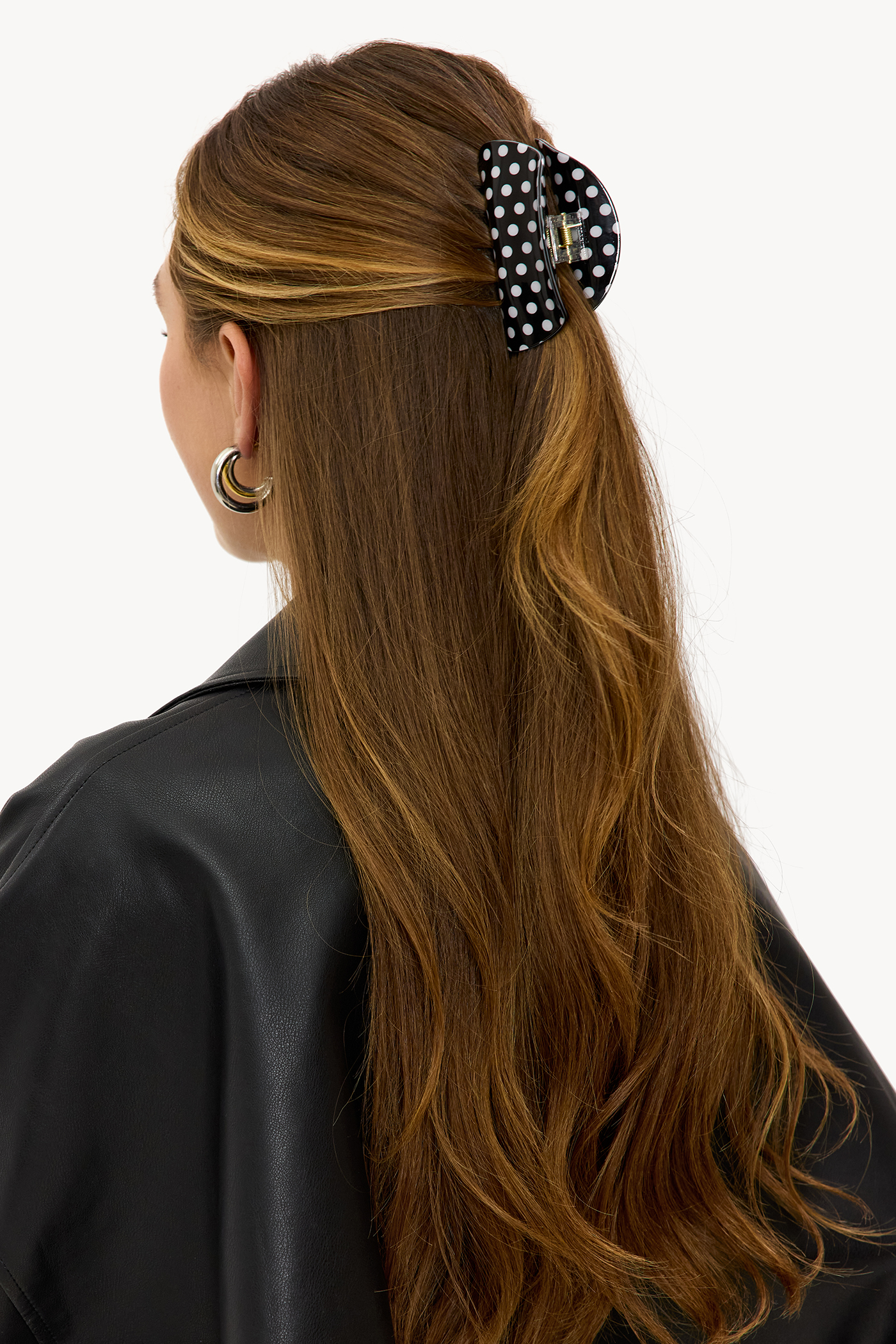 Black hair clip with dots 9,99 €Este clip para el cabello negro presenta un diseño de lunares llamativo con puntos blancos por todas partes. La gran forma de garra asegura un agarre firme y agrega instantáneamente una declaración a cualquier peinado. El clip da un giro vintage a los looks tanto casuales como elegantes.