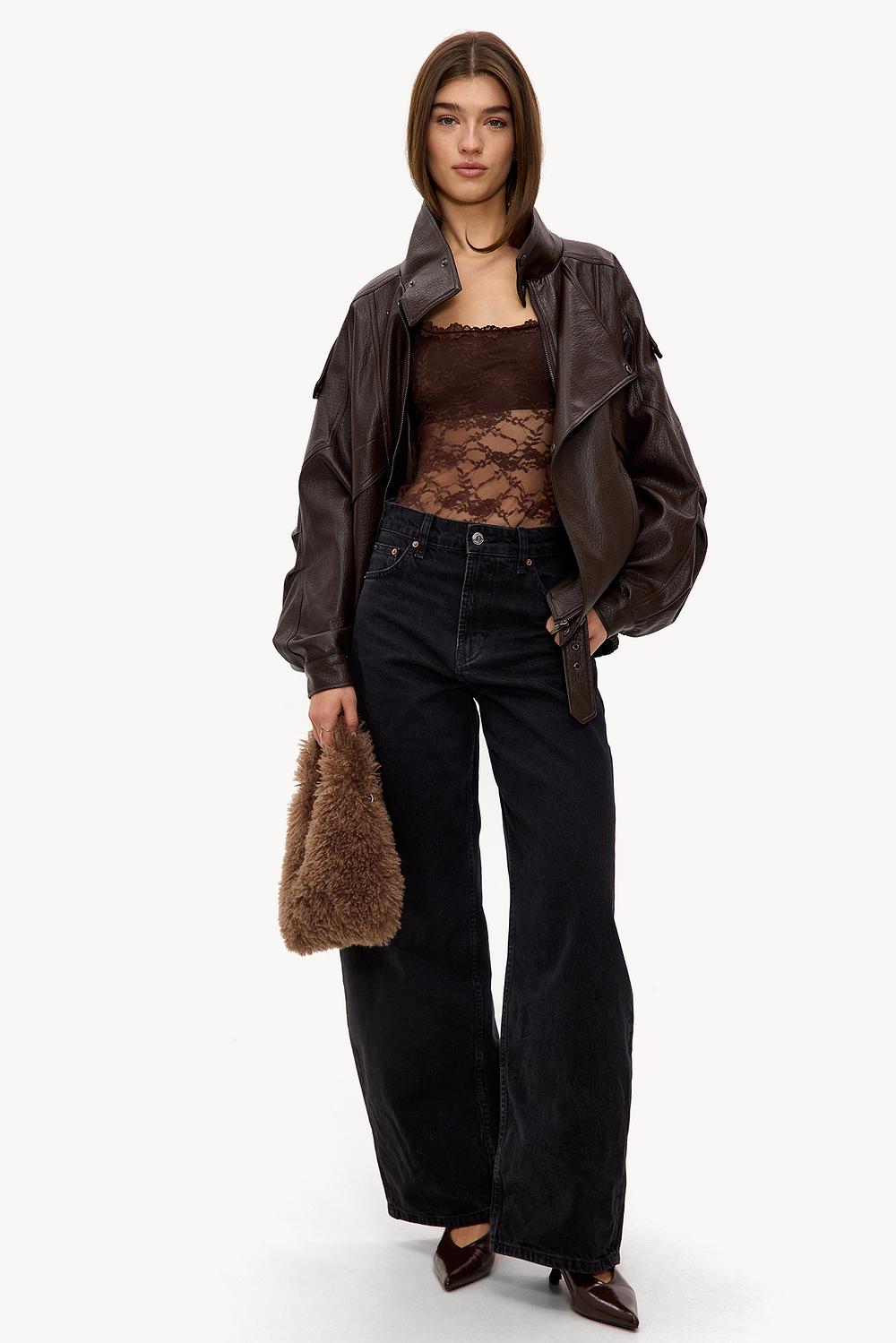 Body marrón oscuro con encaje 25,99 €Este body de encaje marrón presenta un diseño de encaje lujoso con detalles sutiles y transparentes. Los tirantes y el ajuste ceñido crean una forma femenina. La espalda abierta con tirantes decorativos añade un toque extra a esta pieza destacada. Combina este body con jeans de cintura alta y un blazer oversize para un contraste elegante.