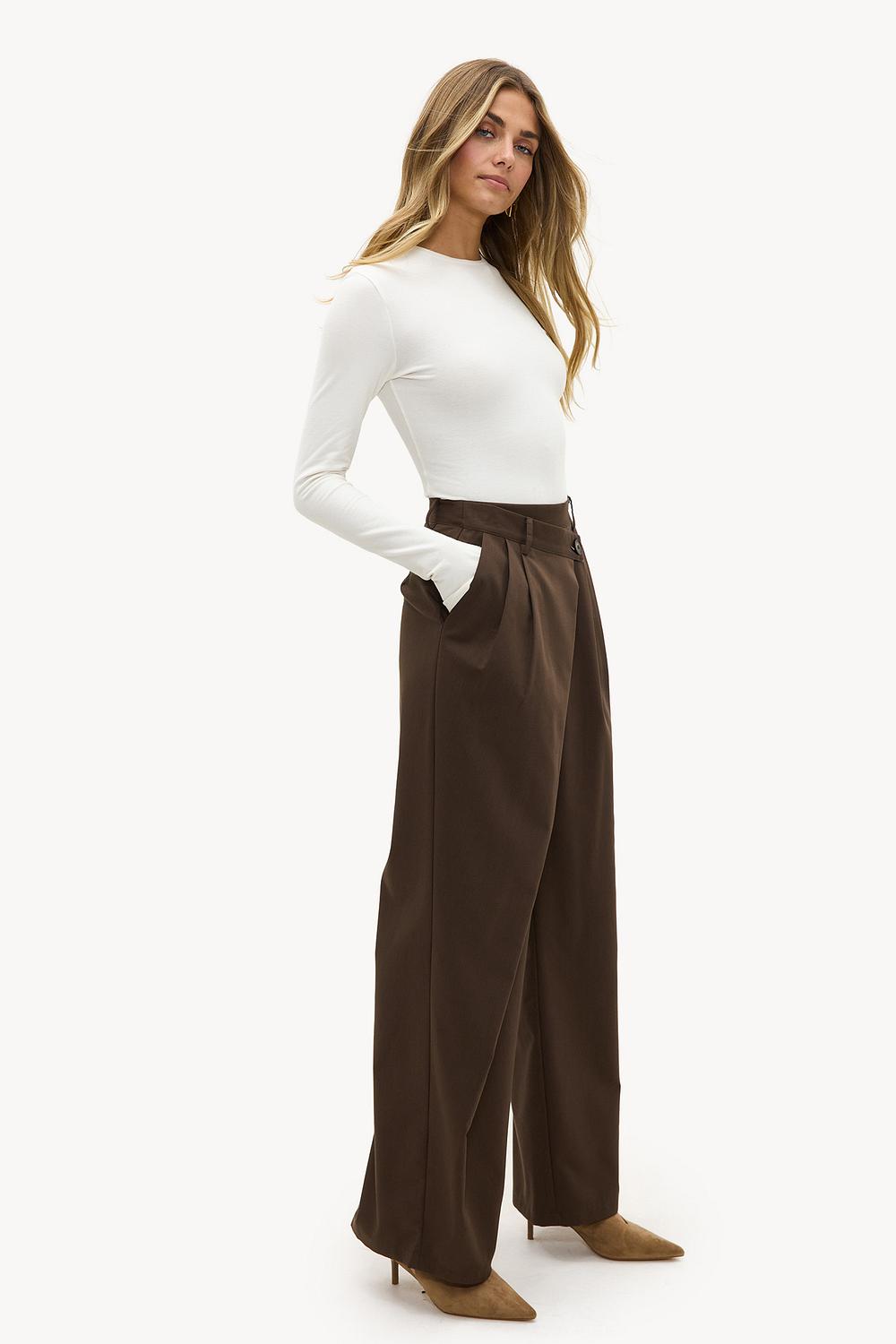 Pantalón cruzado marrón oscuro 49,99 €Este pantalón de pierna ancha marrón presenta un ajuste entallado y elegante con un detalle de envoltura llamativo en la parte delantera. El diseño de cintura alta con piernas anchas crea un aspecto lujoso que es perfecto para los días de oficina. El botón decorativo y los pliegues sutiles le dan a este pantalón un toque moderno. Combina este pantalón con un top ajustado para un look equilibrado.