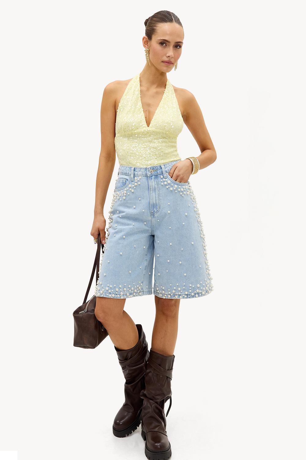 Short azul con perlas 49,99 €Estos shorts de mezclilla azul claro cuentan con perlas llamativas por todas partes para un look de declaración lujoso. El ajuste de talle alto con diseño de 5 bolsillos y corte de pierna ancha crea un giro moderno en el denim clásico. Los detalles de perlas le dan a estos shorts un toque glamuroso que es perfecto para una noche de chicas.