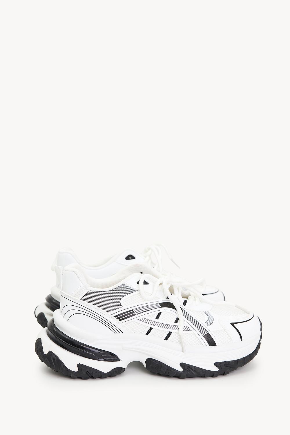 Estas zapatillas chunky blancas con suela negra y detalles negros le dan a tu conjunto deportivo un toque moderno y atrevido al instante. Los detalles de malla y la suela gruesa proporcionan una vibra atlética, mientras que el cierre de cordones ofrece un soporte firme y un ajuste perfecto durante todos tus movimientos. Combínalas con tus leggings favoritos y un top deportivo corto para un look completamente listo para el deporte, ideal para Pilates, Barre o un día casual en el gimnasio.
