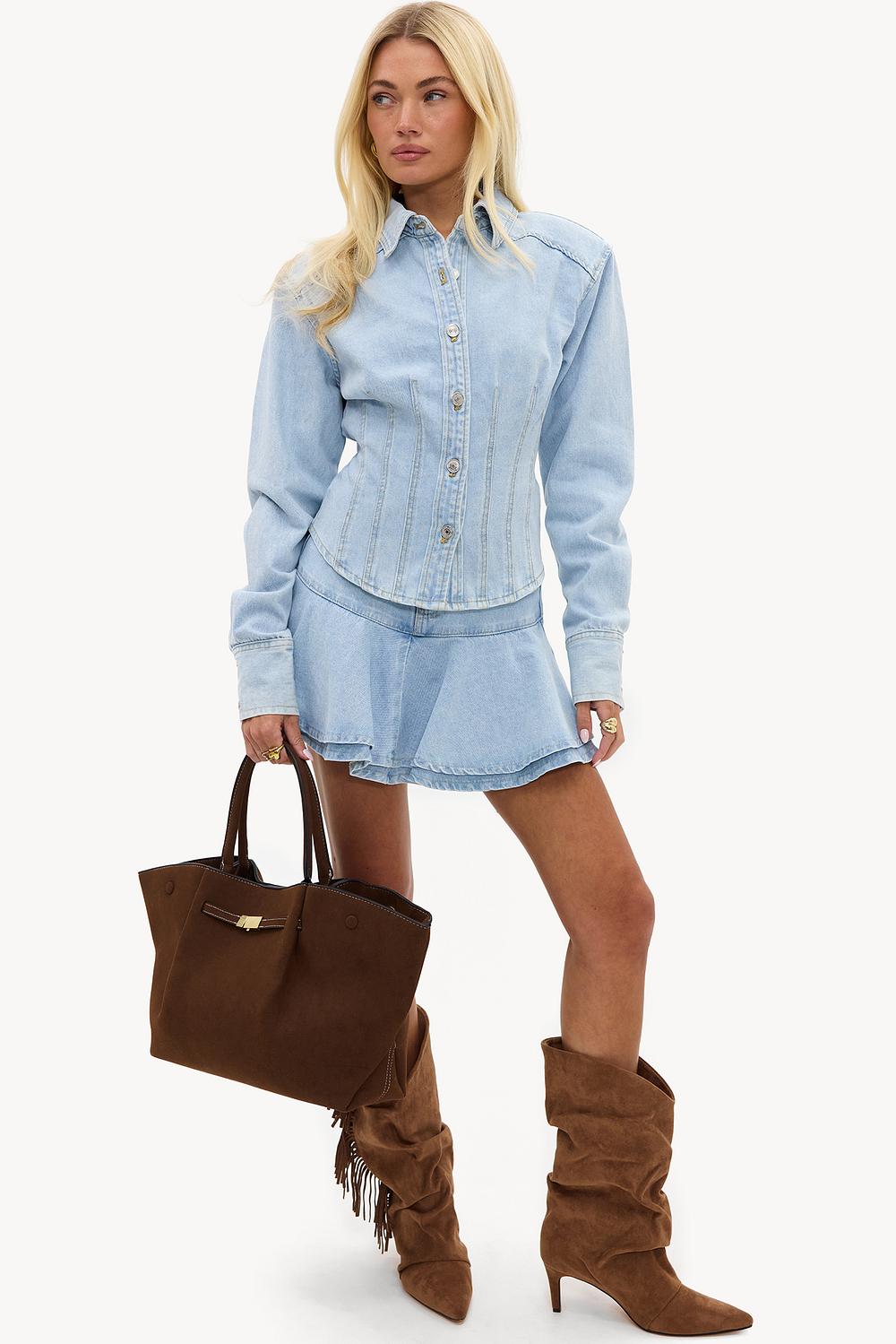 Esta blusa de mezclilla azul claro tiene un ajuste entallado con costuras contrastantes para un toque moderno. El cierre de botones clásico y el cuello le dan a este diseño de mezclilla una actualización chic. El ajuste entallado con pliegues sutiles crea una forma a la moda. Combina esta blusa con la falda pantalón de mezclilla a juego para un look coordinado impresionante.