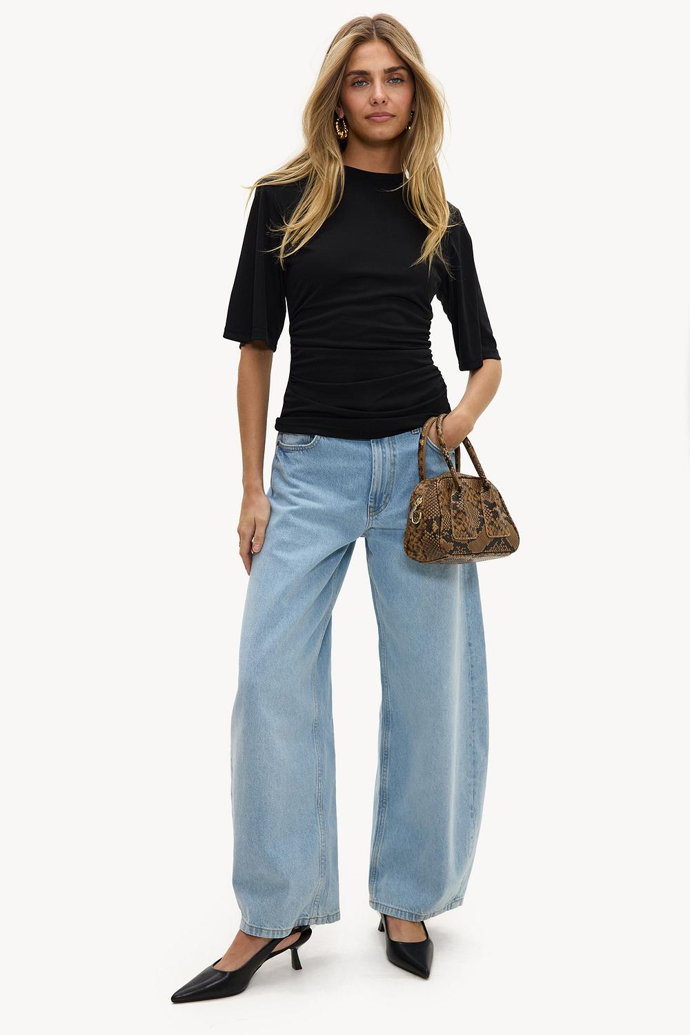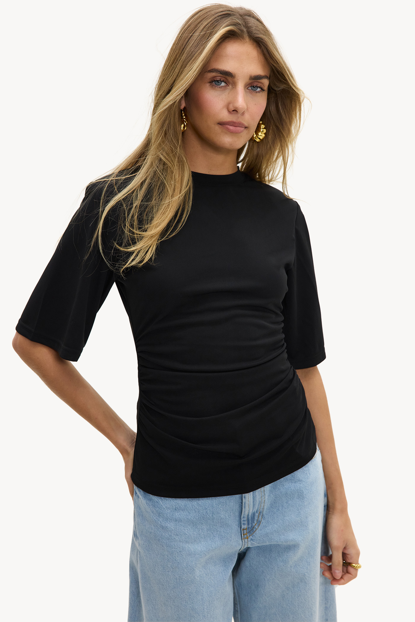 Top negro 29,99 €Este top negro presenta un cuello simulado chic con mangas cortas para un look moderno. El ajuste ceñido con fruncidos sutiles en el lateral acentúa elegantemente la forma. La calidad elástica asegura comodidad y un ajuste perfecto. Combina este top con jeans de pierna ancha para un look chic sin esfuerzo.