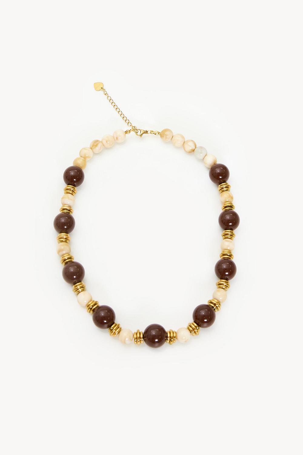 Este collar llamativo combina cuentas marrones con acentos dorados para un look chic. El patrón alternado de cuentas redondas y separadores dorados crea una apariencia lujosa. El cierre ajustable asegura un ajuste perfecto con cualquier atuendo. Combina este collar con una blusa lisa para un toque sofisticado.