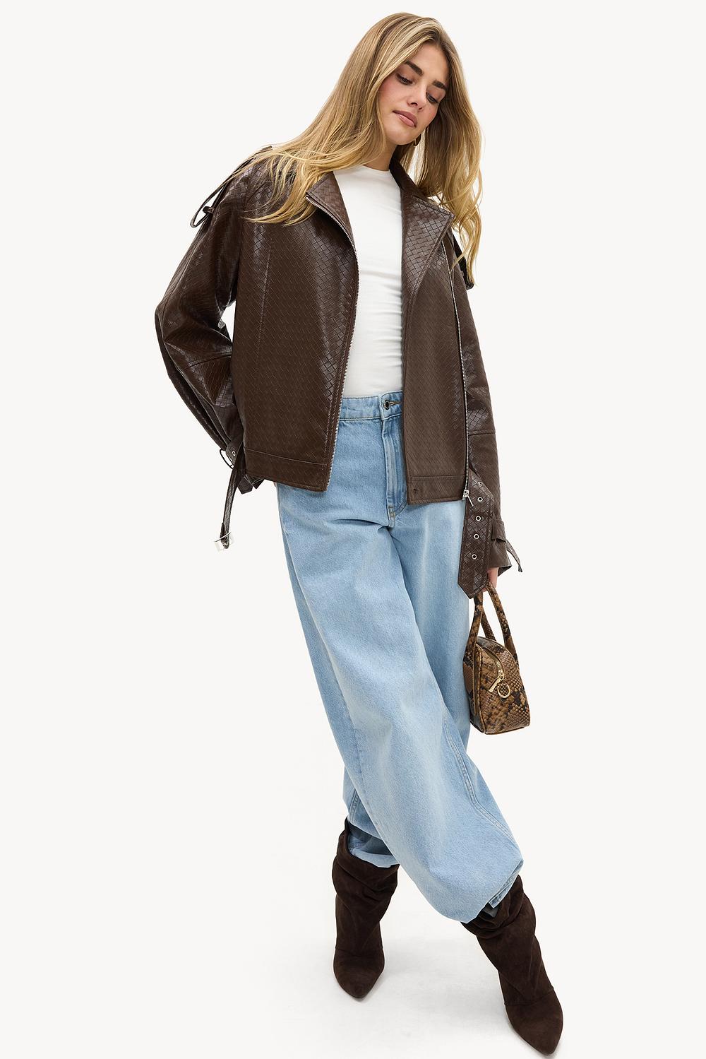 Esta chaqueta de aspecto cuero marrón presenta un llamativo patrón tejido en toda su superficie para un look texturizado lujoso. El ajuste oversize con mangas abullonadas y cinturón ajustable crea una silueta fresca. La cremallera asimétrica y los sutiles tachones le dan a esta chaqueta de motociclista un giro atrevido. Combina esta chaqueta con jeans de pierna ancha y botas para un look casual chic.