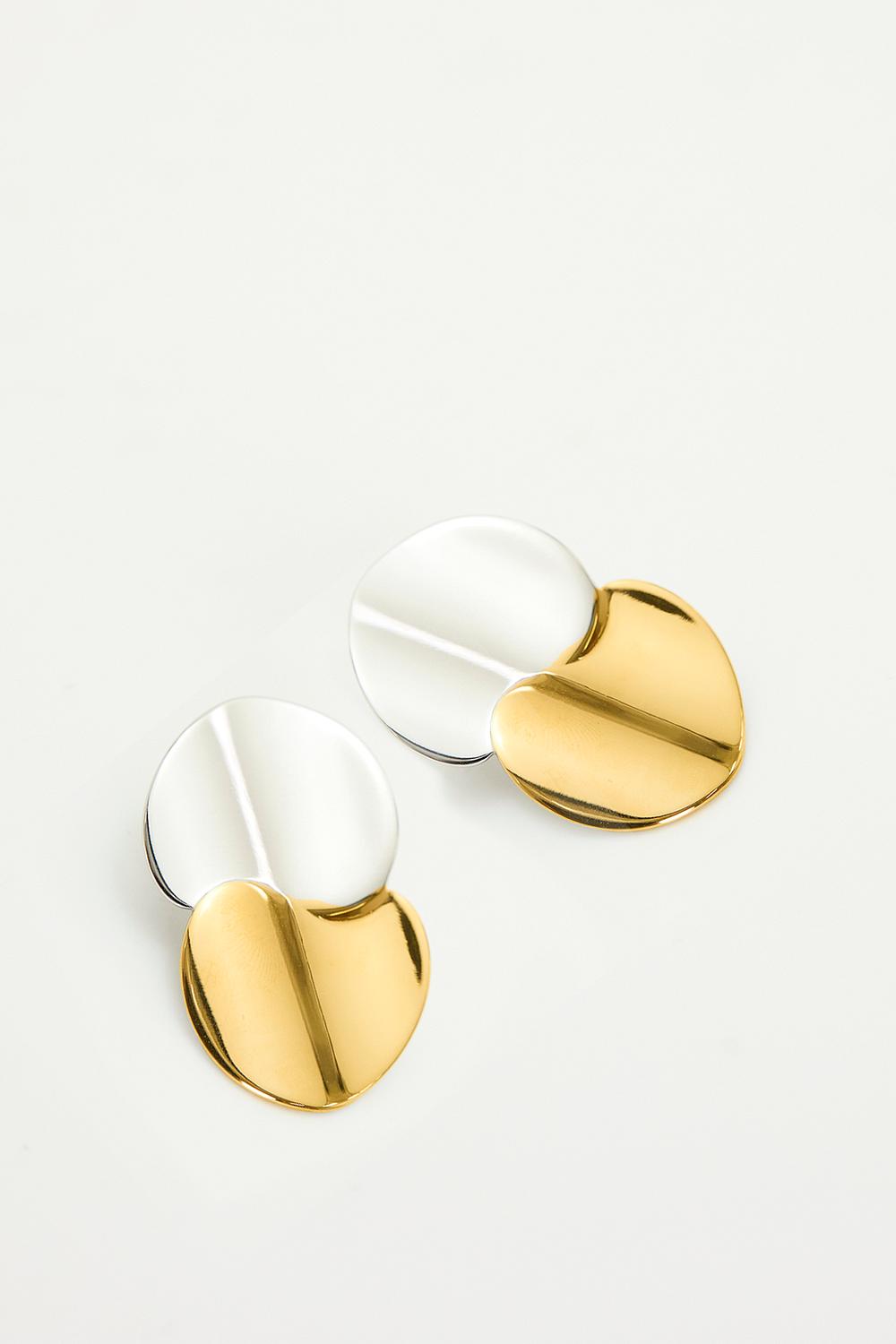 Pendientes dorados y plateados 12,99 €Estos pendientes de declaración presentan un llamativo diseño bicolor con acentos dorados y plateados. El diseño geométrico moderno combina superficies brillantes para una apariencia lujosa. La forma redonda con colores contrastantes crea un look chic que combina perfectamente con atuendos casuales y elegantes. Estos pendientes están hechos de acero inoxidable de alta calidad con un baño de oro para durabilidad y brillo.
