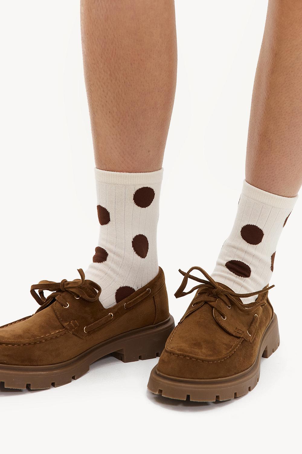 Calcetines blancos con lunares marrones 7,99 €Estos calcetines blancos presentan un llamativo patrón de lunares en marrón para un look llamativo. La mezcla de algodón asegura comodidad y transpirabilidad durante todo el día. La altura media crea un giro moderno en el diseño clásico de calcetines. Combina estos calcetines con mocasines gruesos para un estilo preppy fresco.