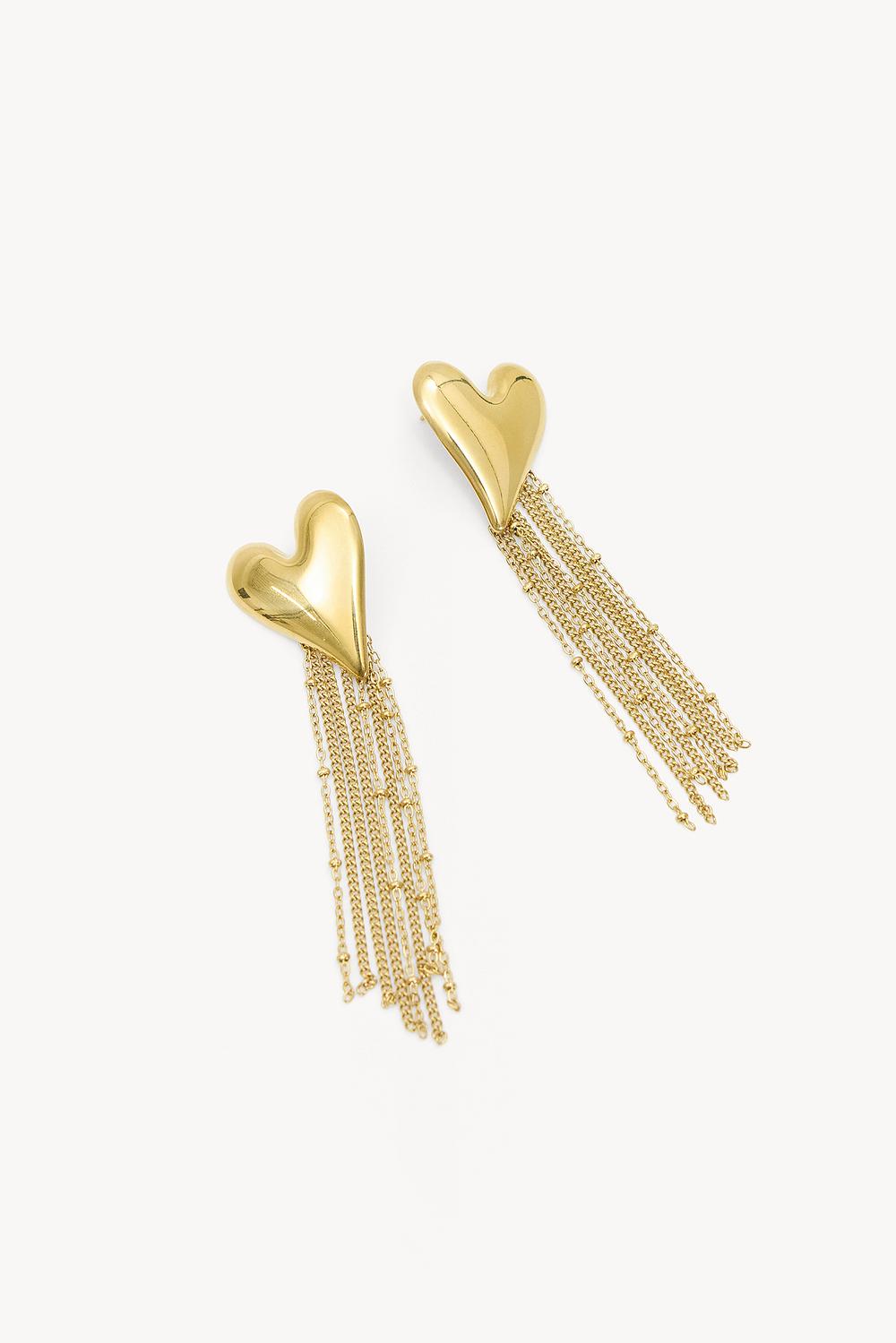 Estos pendientes dorados de declaración presentan un llamativo diseño de corazón con flecos de cadena móviles. El acabado enchapado en oro de lujo sobre acero inoxidable asegura una calidad duradera. Las largas cadenas crean un efecto dinámico con cada movimiento para un toque elegante.