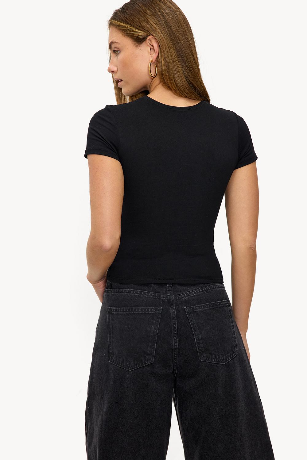 Camiseta negra de manga corta 25,99 €Este top corto negro tiene un ajuste ceñido que acentúa perfectamente tu figura. Las mangas cortas y el cuello redondo le dan a este artículo básico un aspecto limpio y moderno. La calidad elástica garantiza comodidad y un ajuste favorecedor. Combina este top con jeans de pierna ancha de talle alto para un look casual y chic.