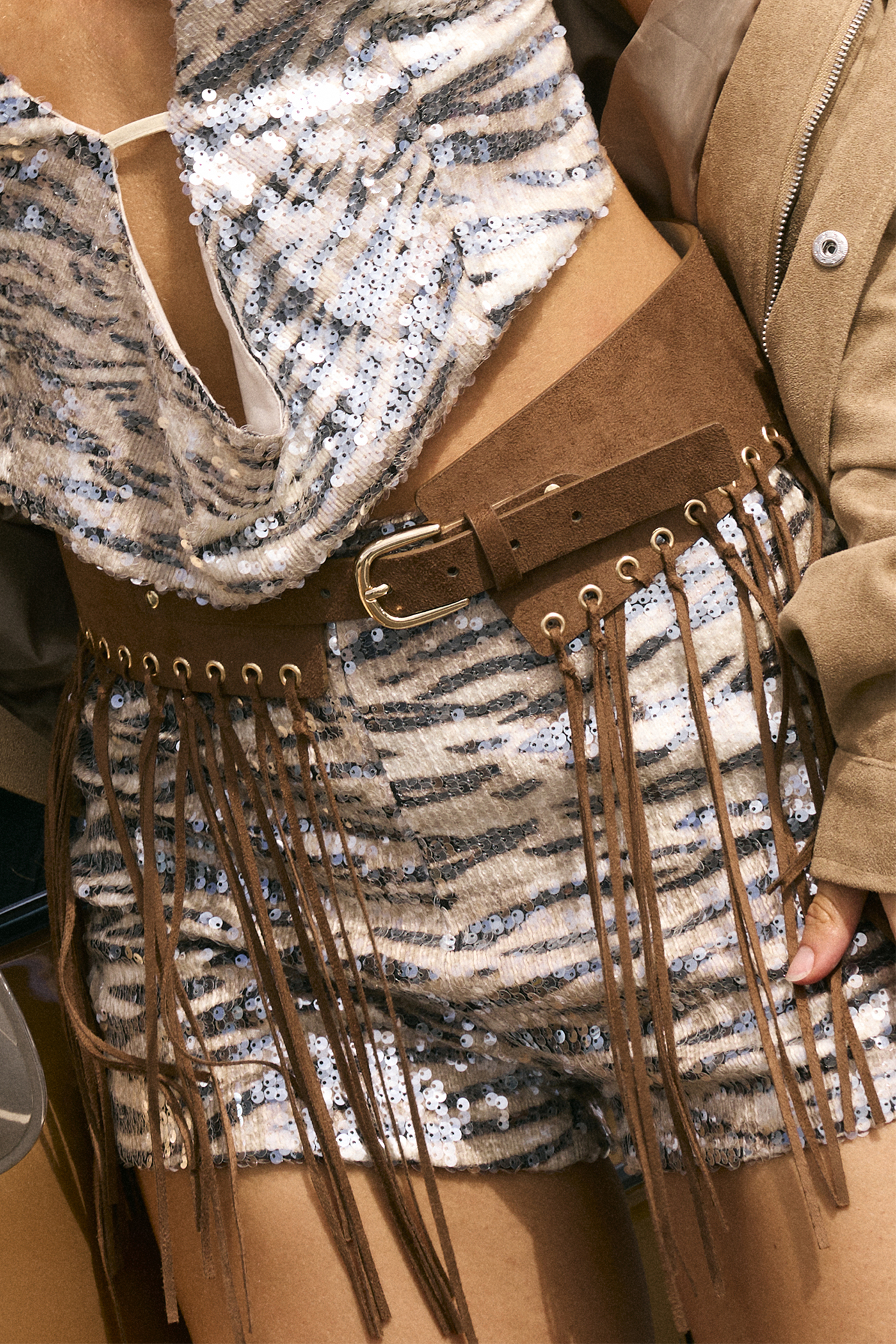 Cinturón marrón con flecos. 29,99 €Este cinturón ancho de color marrón similar a la gamuza presenta flecos llamativos para un look inspirado en el oeste. El cinturón ancho con tachuelas y detalles de flecos largos crea un ambiente boho atrevido. La hebilla ajustable asegura un ajuste perfecto alrededor de la cintura. Combina este cinturón sobre un blazer oversize con un vestido mini para un look listo para el festival.