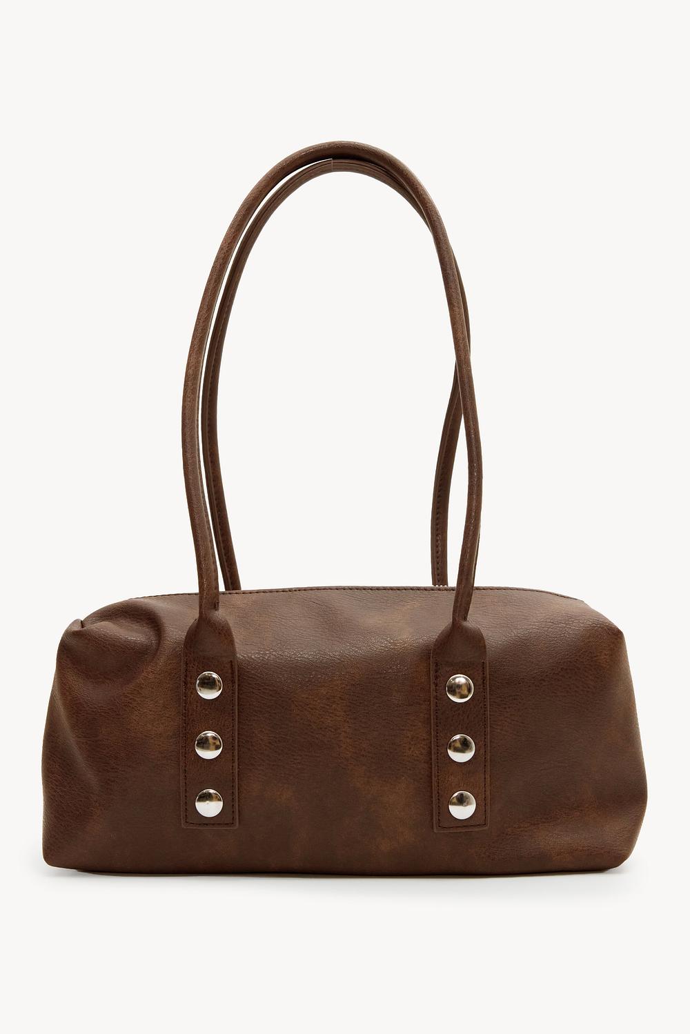 Este bolso de hombro marrón presenta un aspecto lujoso de cuero vegano con detalles de tachuelas llamativos. La forma compacta con asas dobles y herrajes plateados crea un toque atrevido. El tamaño práctico hace que este bolso sea perfecto para el uso diario. Combina este bolso con pantalones cargo y un top corto para un look de festival urbano casual.