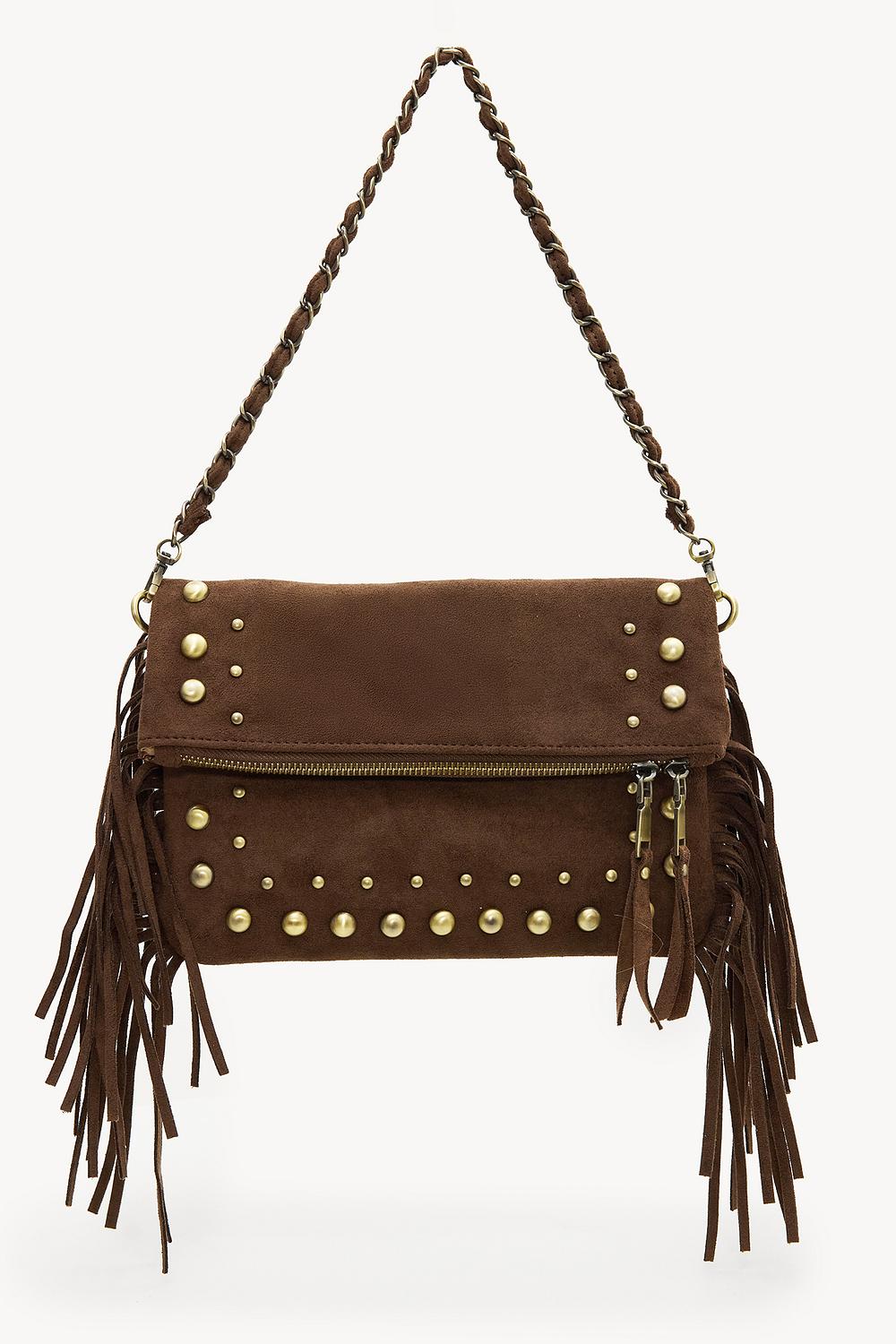 Este bolso bandolera de aspecto ante marrón oscuro cuenta con llamativos tachuelas doradas por todas partes y flecos llamativos para un look boho atrevido. El cierre de solapa práctico con correa de cadena trenzada garantiza comodidad y estilo. Los detalles de flecos en movimiento le dan a este bolso un ambiente de festival fresco. Combina este bolso con un conjunto de mezclilla y botas vaqueras para un look inspirado en el oeste.